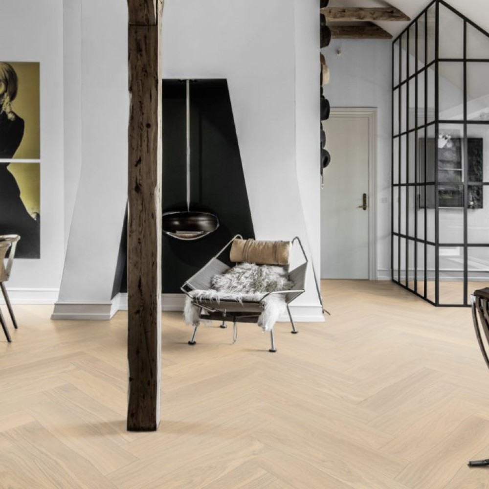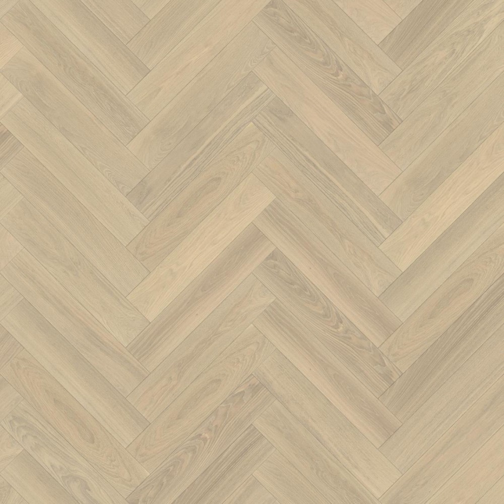 Kahrs Дуб AB Crème White Венгерская елка — это двухслойная инженерная доска из отборной древесины дуба, покрытая защитным белым маслом. Производится в сортировке Calm — это ровная сортировка с небольшими вариациями цвета. Во внешнем виде доски допускаются малочисленные сучки небольшого размера. С течением времени возможно заметное изменение цвета.