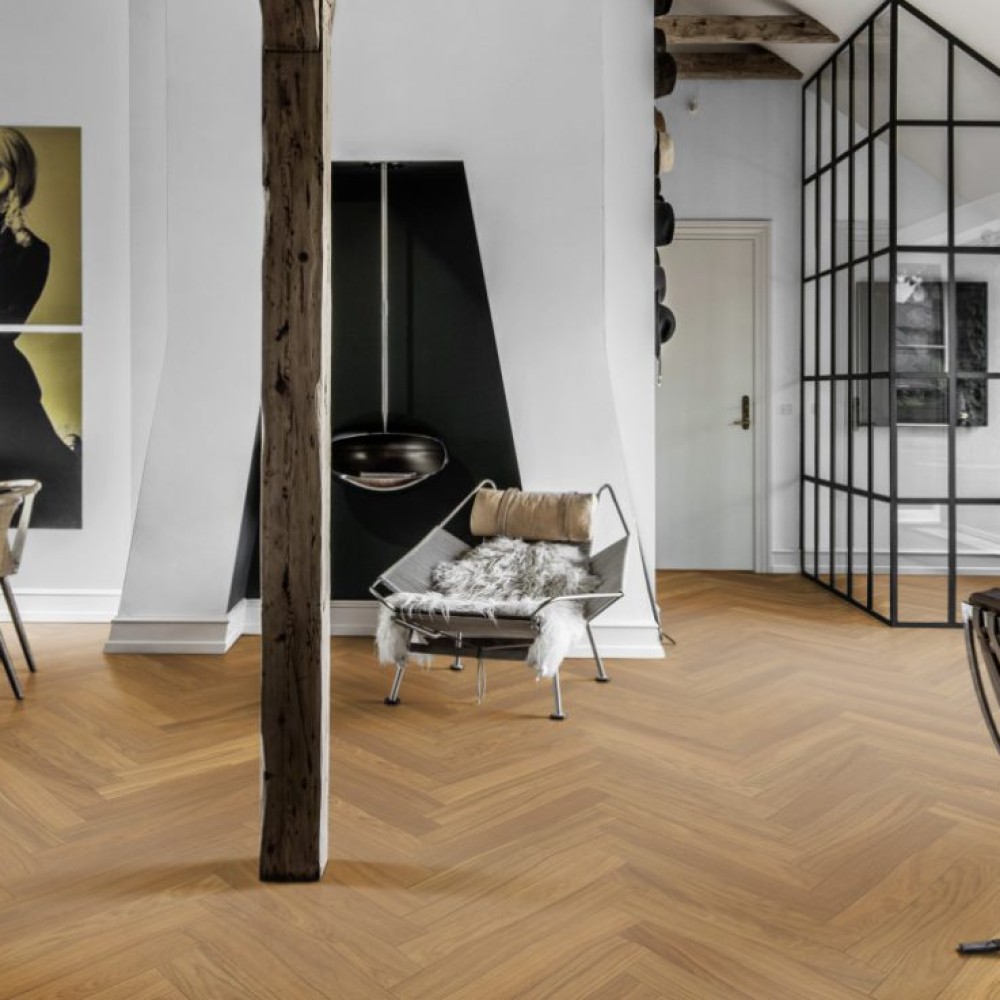 Kahrs Дуб AB Natural Венгерская елка — это двухслойная инженерная доска из отборной древесины дуба, покрытая защитным маслом. Производится в сортировке Calm — это ровная сортировка с небольшими вариациями цвета. Во внешнем виде доски допускаются малочисленные сучки небольшого размера. С течением времени возможно заметное изменение цвета.