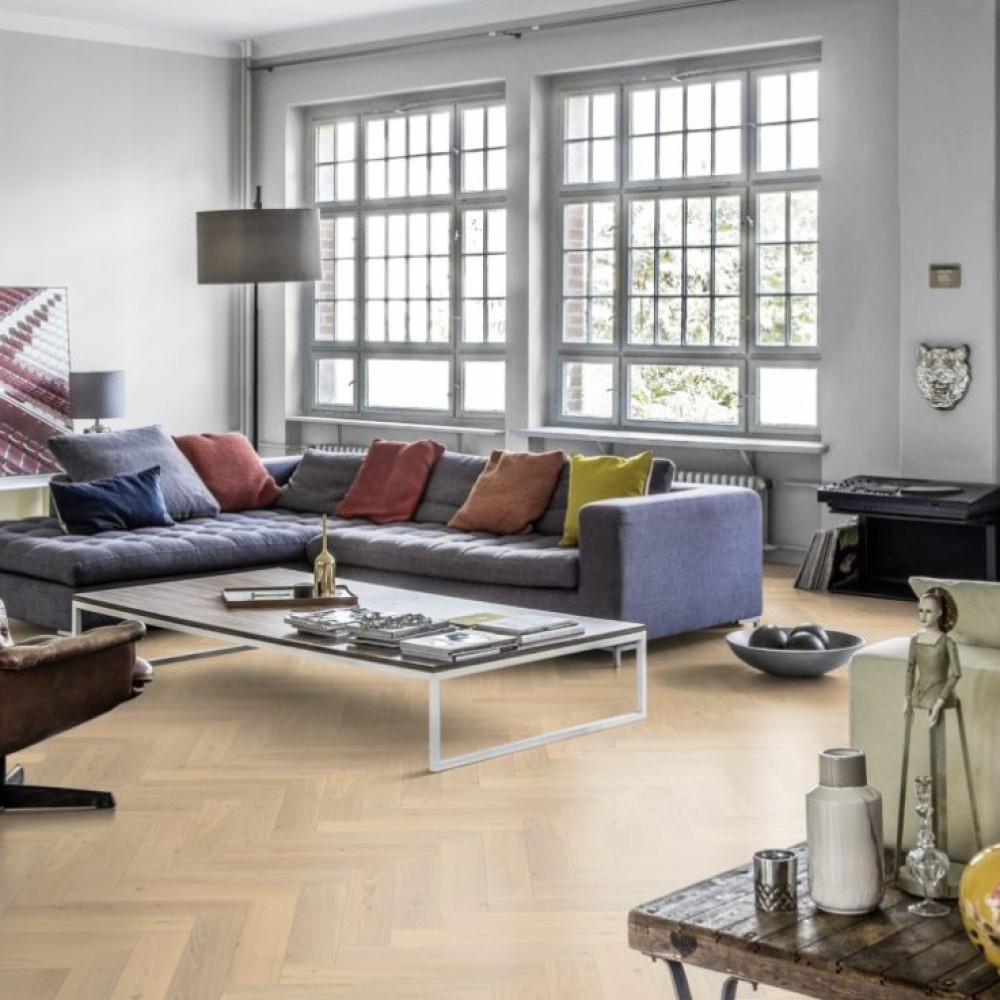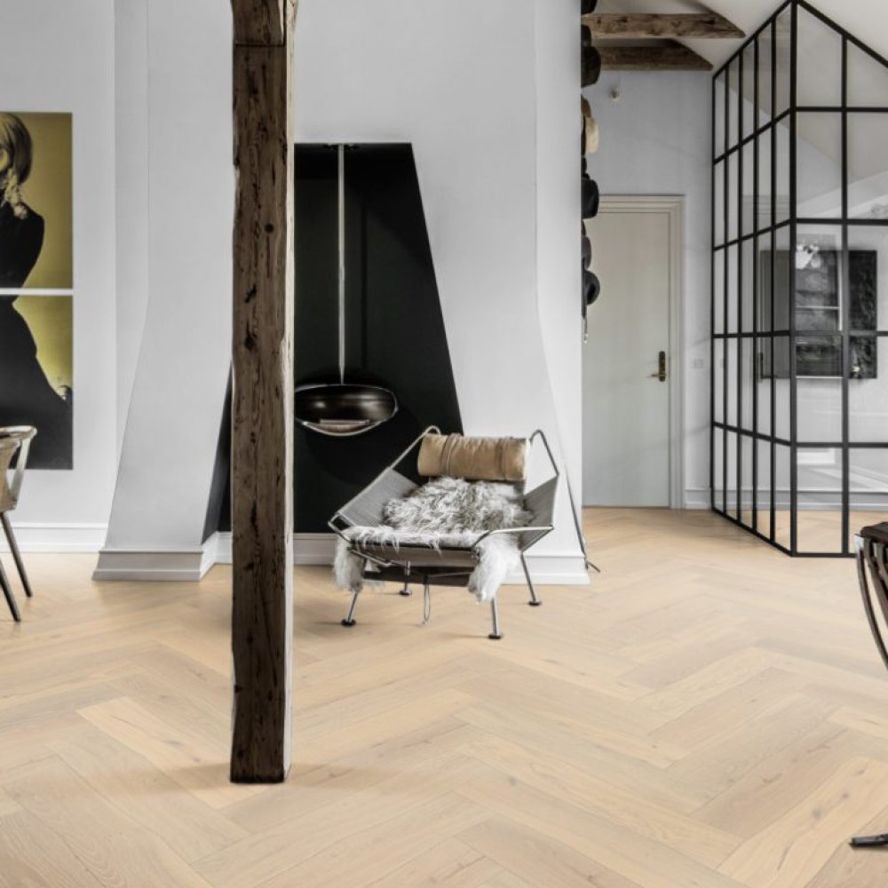 Kahrs Дуб CD Crème White Венгерская елка — это двухслойная инженерная доска из отборной древесины дуба, покрытая защитным белым маслом. Во внешнем виде доски допускаются естественные вариации цвета от светло-коричневого до темно- коричневого, а также крупные плотные и черные сучки. Сучки могут быть различных размеров и в разном количестве. С течением времени возможно заметное изменение цвета доски.