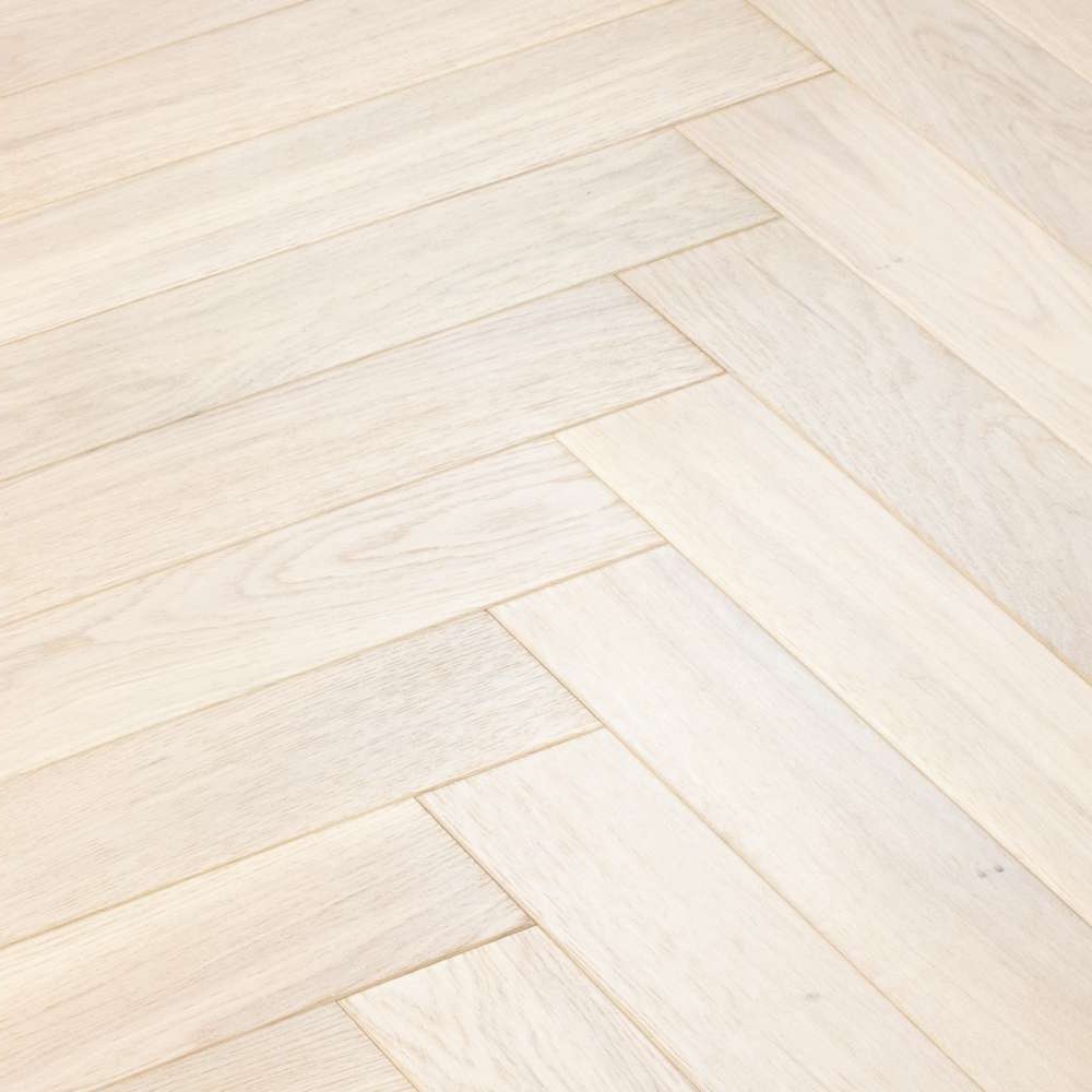 Инженерная доска Lab Arte Дуб Чегет белый в дизайне «венгерская елка» производится в сортировке Натур, где характерны активные вариации цветовых оттенков. На поверхности допускаются живые сучки (до 20 мм) и темные сросшиеся сучки с трещинами (размером до 15 мм и не более 3 шт. на погонный метр), которые зашлифованы и зашпатлеваны в тон покрытия.