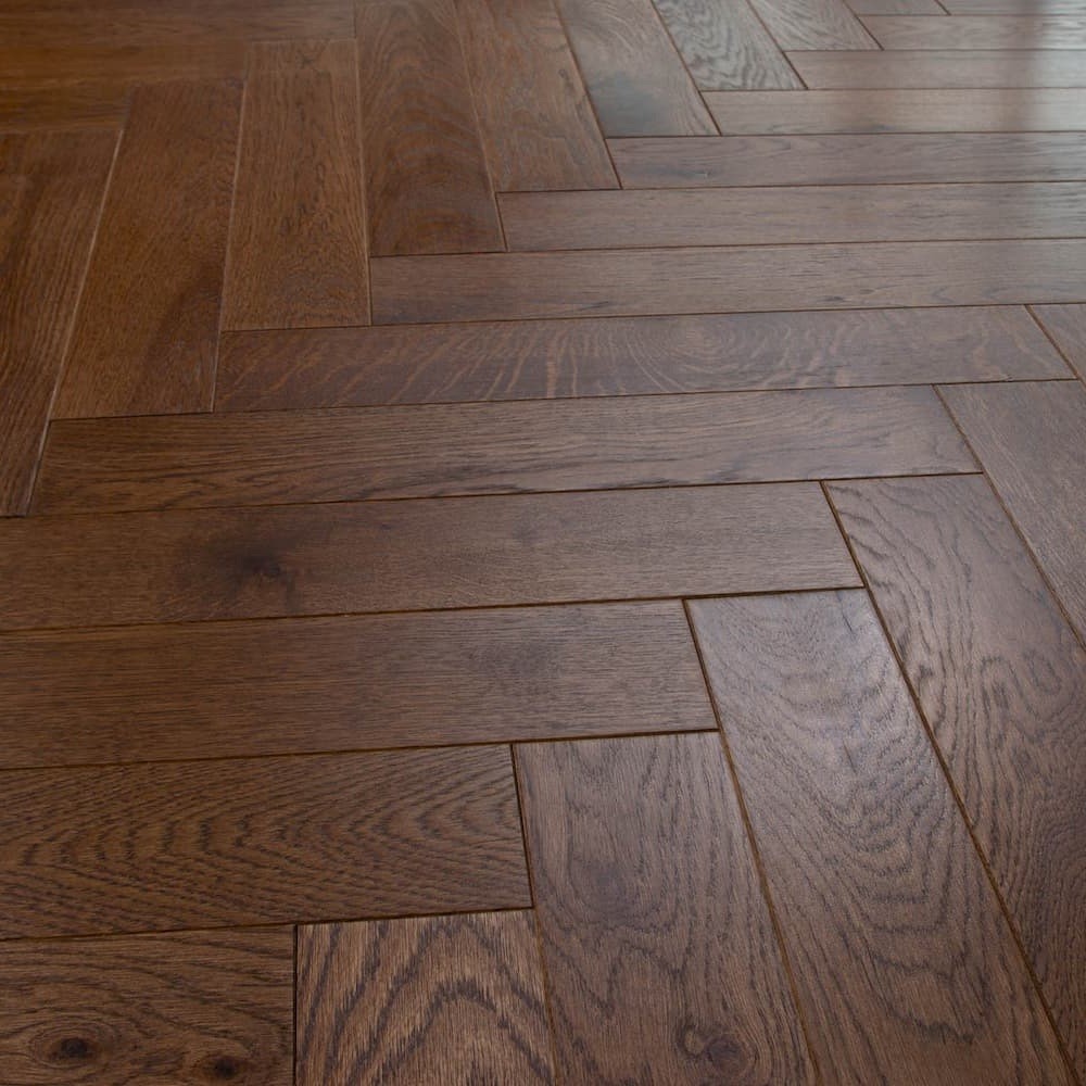 Инженерная доска Lab Arte Дуб Табак в дизайне «венгерская елка» производится в сортировке Селект — для нее характерны естественные цветовые перепады как между планками, так и в пределах одной планки, а также наличие живых сросшихся сучков в цвет древесины диаметром до 10 мм. Кроме того, допускаются темные сросшиеся сучки (размером до 5 мм и не более 3 шт. на погонный метр), зашпатлеванные в тон покрытия.