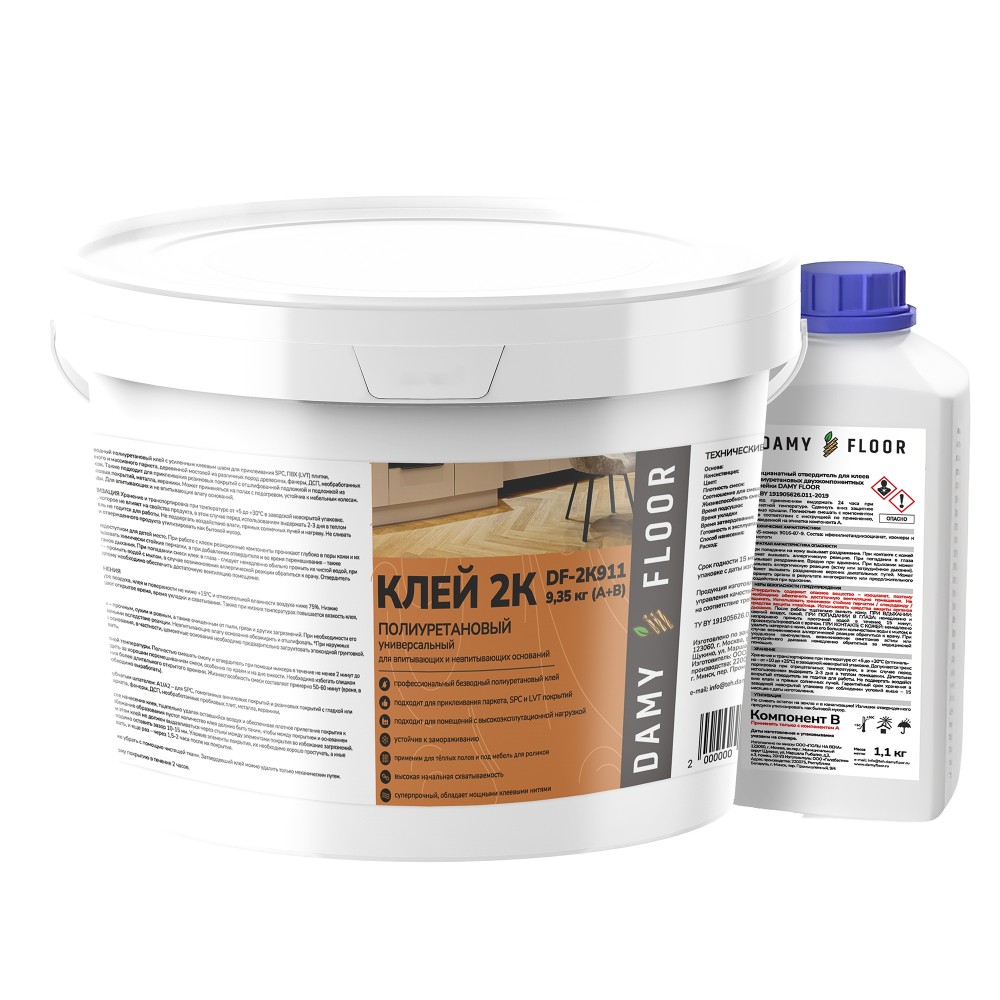 Двухкомпонентный клей Damy Floor DF-2К911 применяется во внутренних работах для приклеивания виниловой плитки, а также других покрытий (таких как паркетная доска, фанера, ДСП, пробка) на любые впитывающие и невпитывающие основания. Создает прочный клеевой шов для плотного сцепления покрытия с основанием, устойчив к мебельным колесам, подходит для помещений с высокой эксплуатационной нагрузкой. Не содержит воды и растворителей, выдерживает до 5 циклов замораживания и оттаивания без потери свойств при транспортировке. Подходит для использования на полах с подогревом.