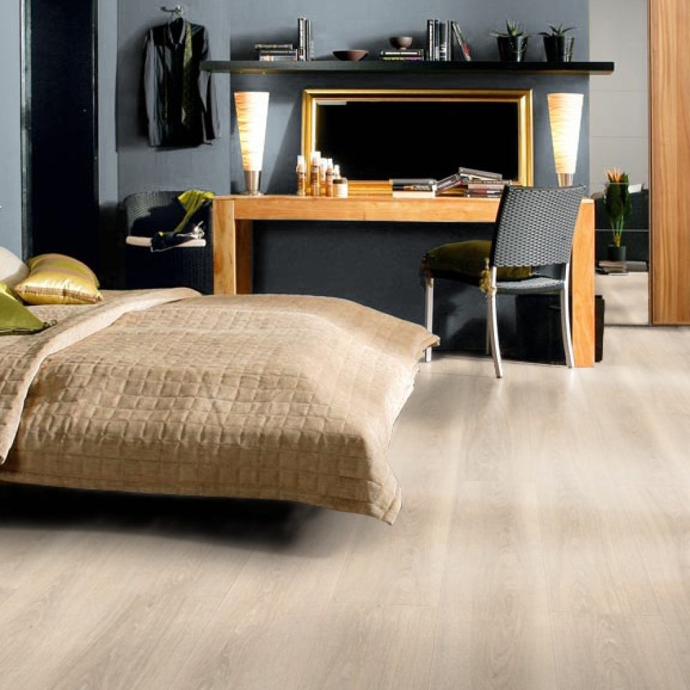 Ламинат Haro Gran Via 4V дуб белый выбеленный – современное технологичное напольное покрытие, визуально практически неотличимое от древесного массива или паркетной доски. Его рисунок и цвет идеально передают эстетику натурального дерева, благодаря высококачественной печати на поверхности материала. Также природности добавляет и рельеф «брашированной» поверхности, и фаска по периметру доски.