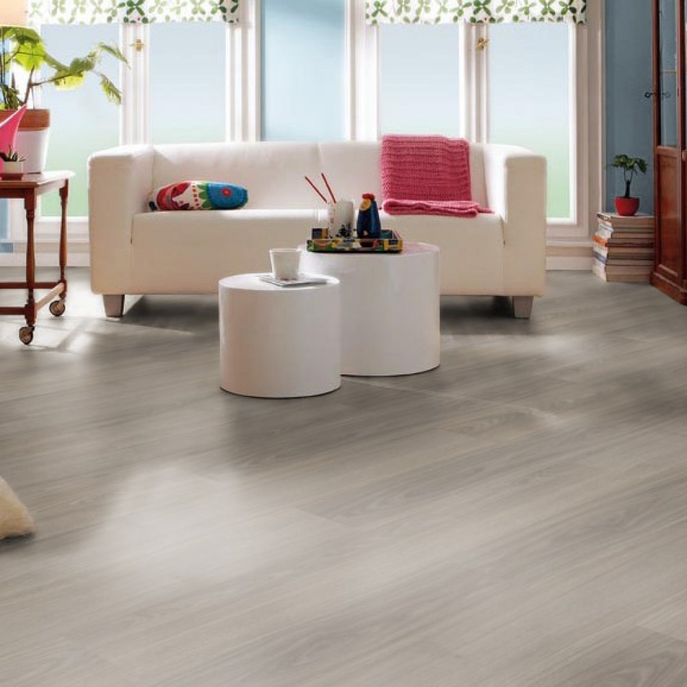 Поверхность доски — полуматовая, с каждой стороны плашки нанесена фаска. Система Top Connect гарантирует простую укладку. Срок гарантии на ламинат дуб античный серый из коллекции Tritty 100 составляет 20 лет!