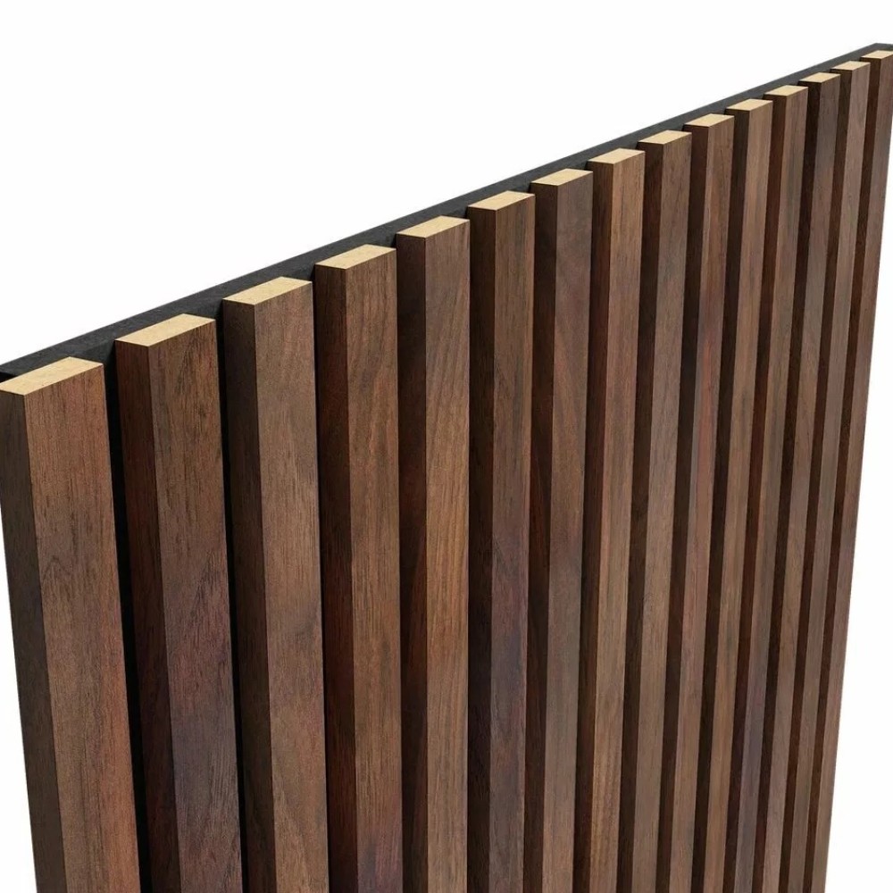 Акустическая стеновая панель Cosca Decor Дуб Барон Темный применяется во внутренней отделке стен для создания акустического комфорта без эха и внешнего шума. Основа панели — антибактериальный акустический войлок 9 мм, на котором закреплены 15 декоративных реек из МДФ размером 25×10 мм.
