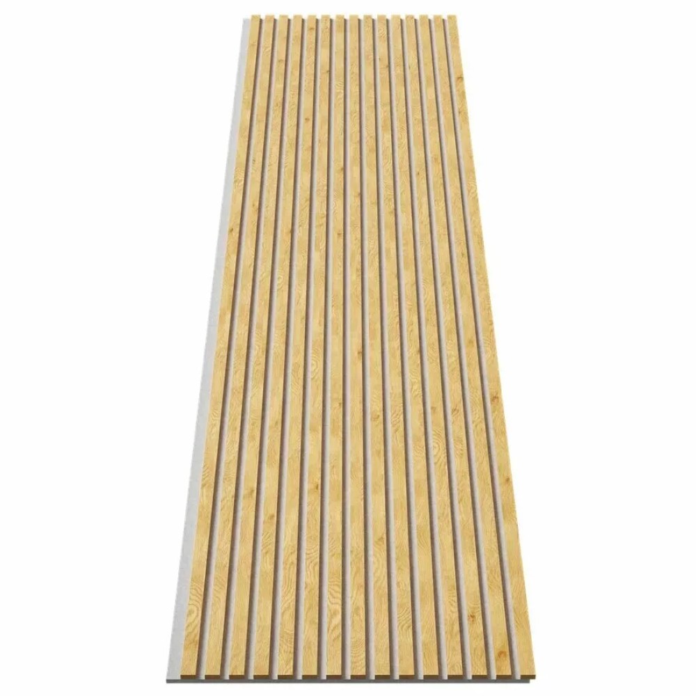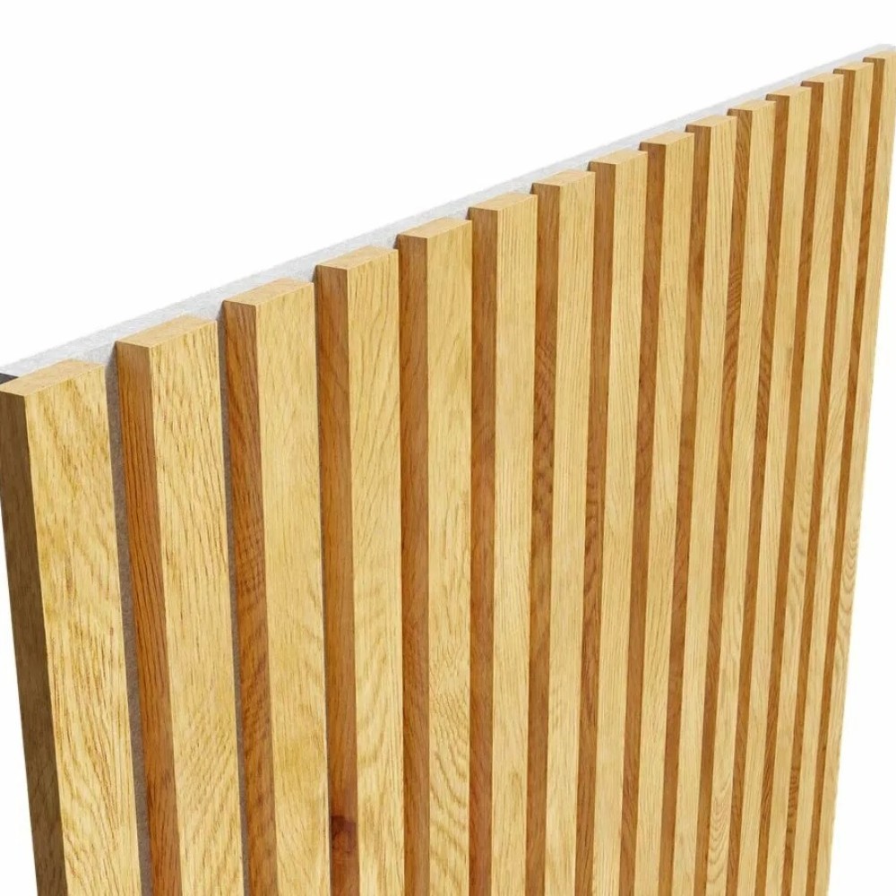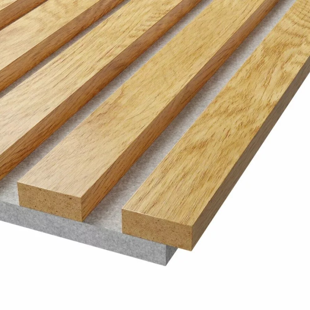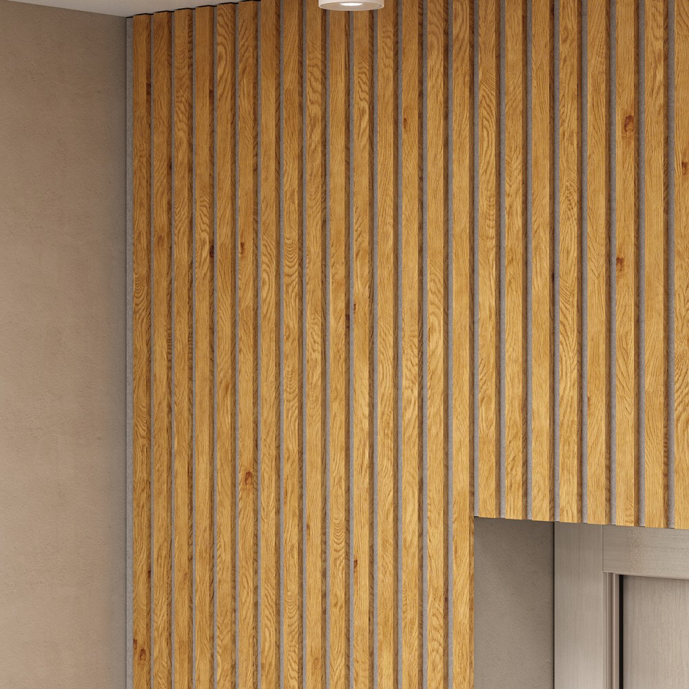 Поверхность реек облицована «экошпоном», который визуально и тактильно имитирует древесину дуба. Монтаж с помощью жидких гвоздей или саморезов со шляпкой в цвет войлока.