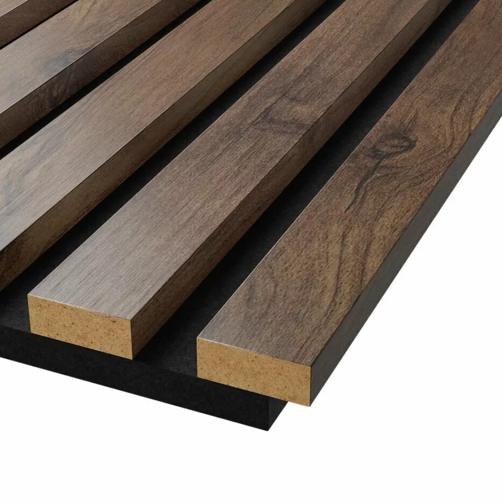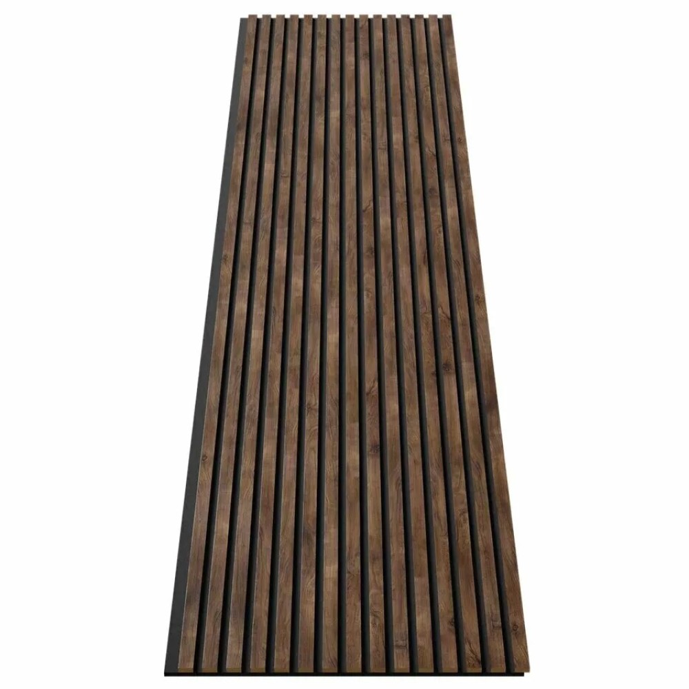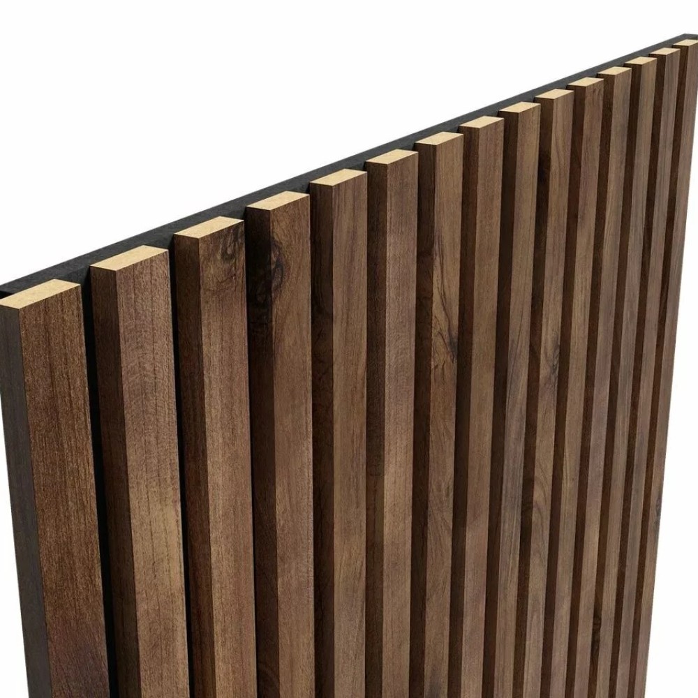 Акустическая стеновая панель Cosca Decor Дуб Старинный Натуральный применяется во внутренней отделке стен для создания акустического комфорта без эха и внешнего шума. Основа панели — антибактериальный акустический войлок 9 мм, на котором закреплены 15 декоративных реек из МДФ размером 25×10 мм.