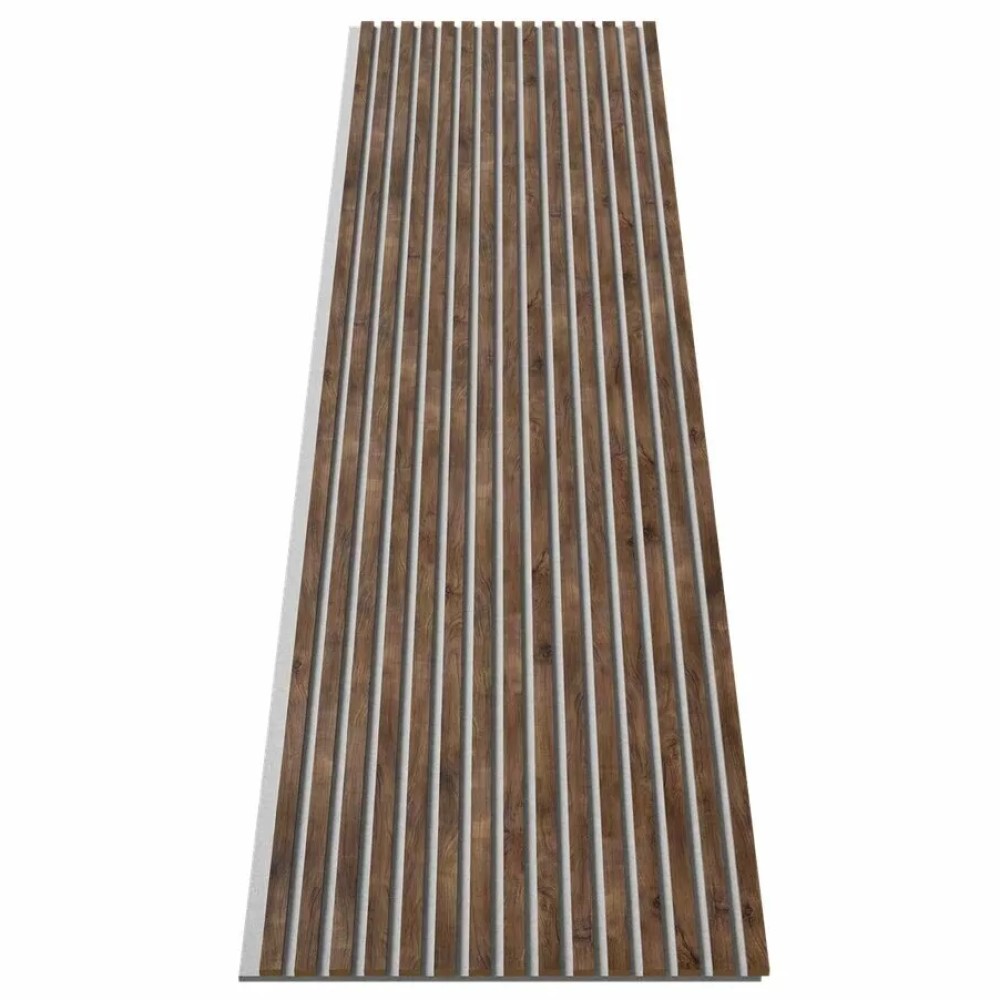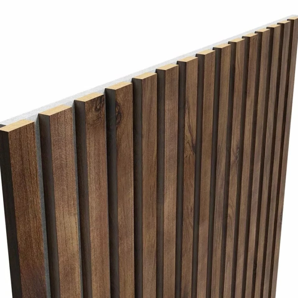 Акустическая стеновая панель Cosca Decor Дуб Старинный Натуральный применяется во внутренней отделке стен для создания акустического комфорта без эха и внешнего шума. Основа панели — антибактериальный акустический войлок 9 мм, на котором закреплены 15 декоративных реек из МДФ размером 25×10 мм.