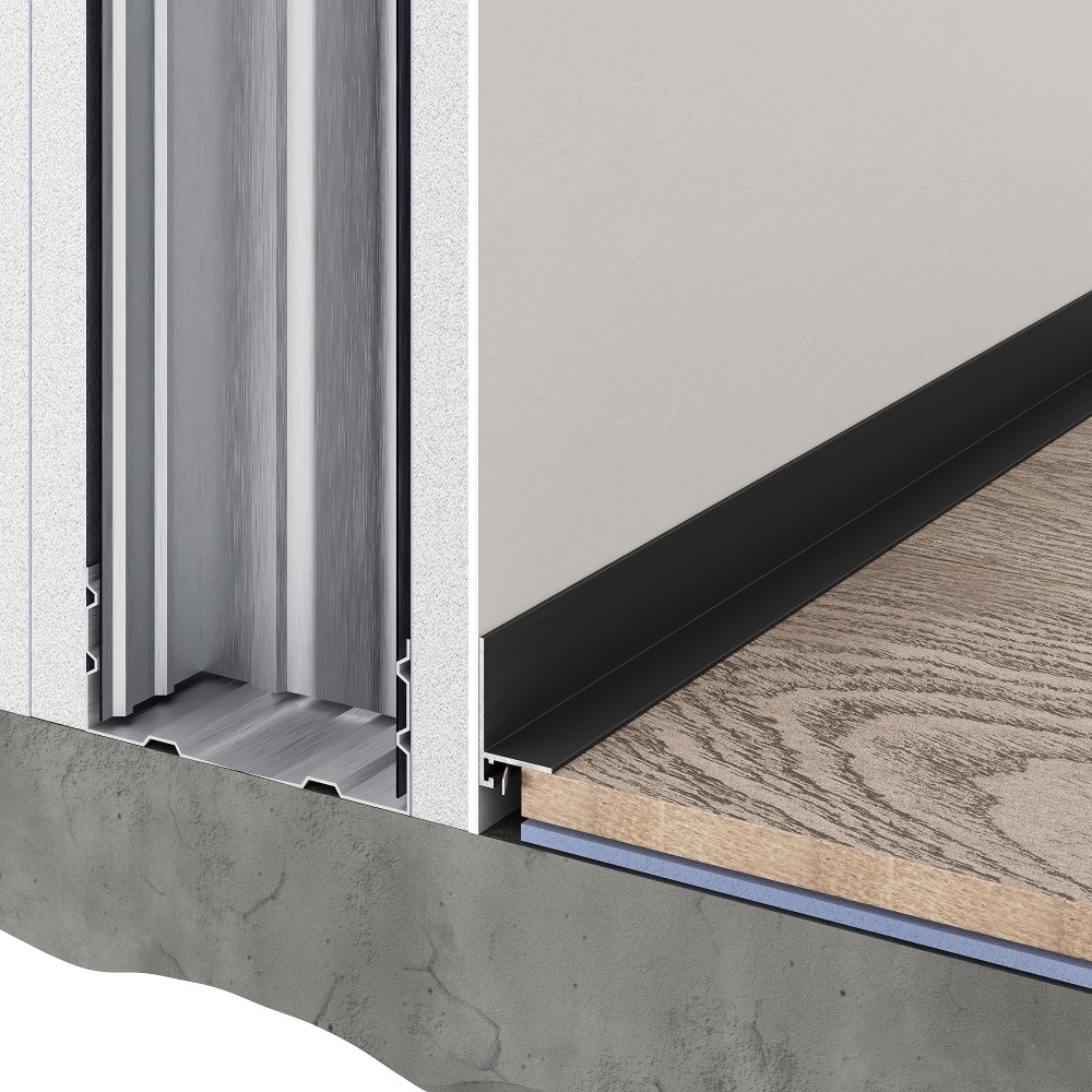 Подходит для напольных покрытий толщиной от 5 мм. Техническая высота плинтуса составляет 26 мм, из которых 5 мм будут скрыты после монтажа в глубину напольного покрытия. Установка плинтуса производится с помощью крепежных зажимов, которые идут в комплекте.