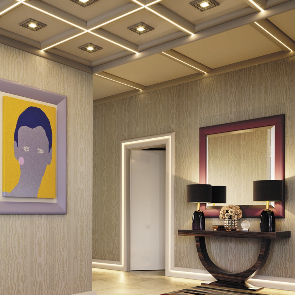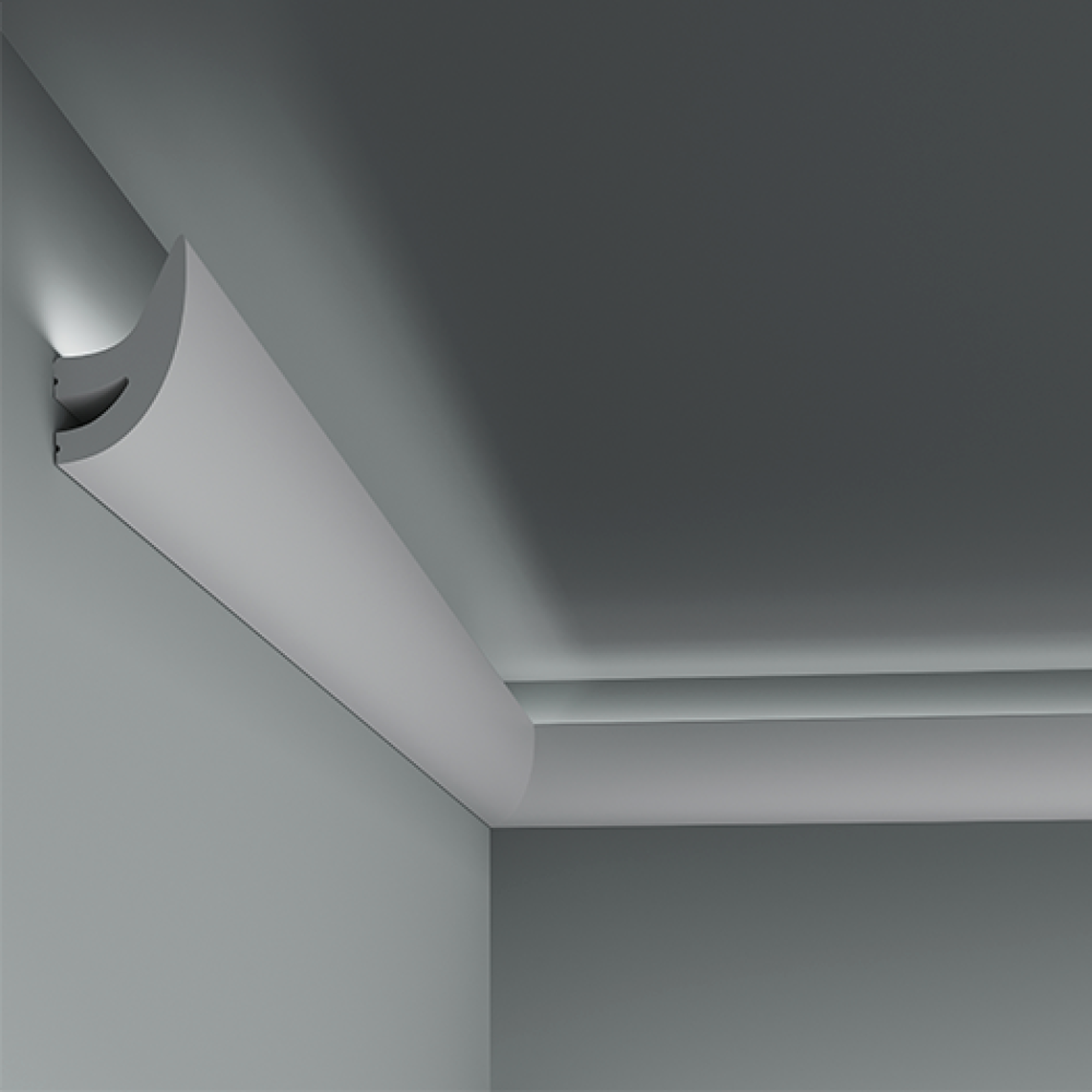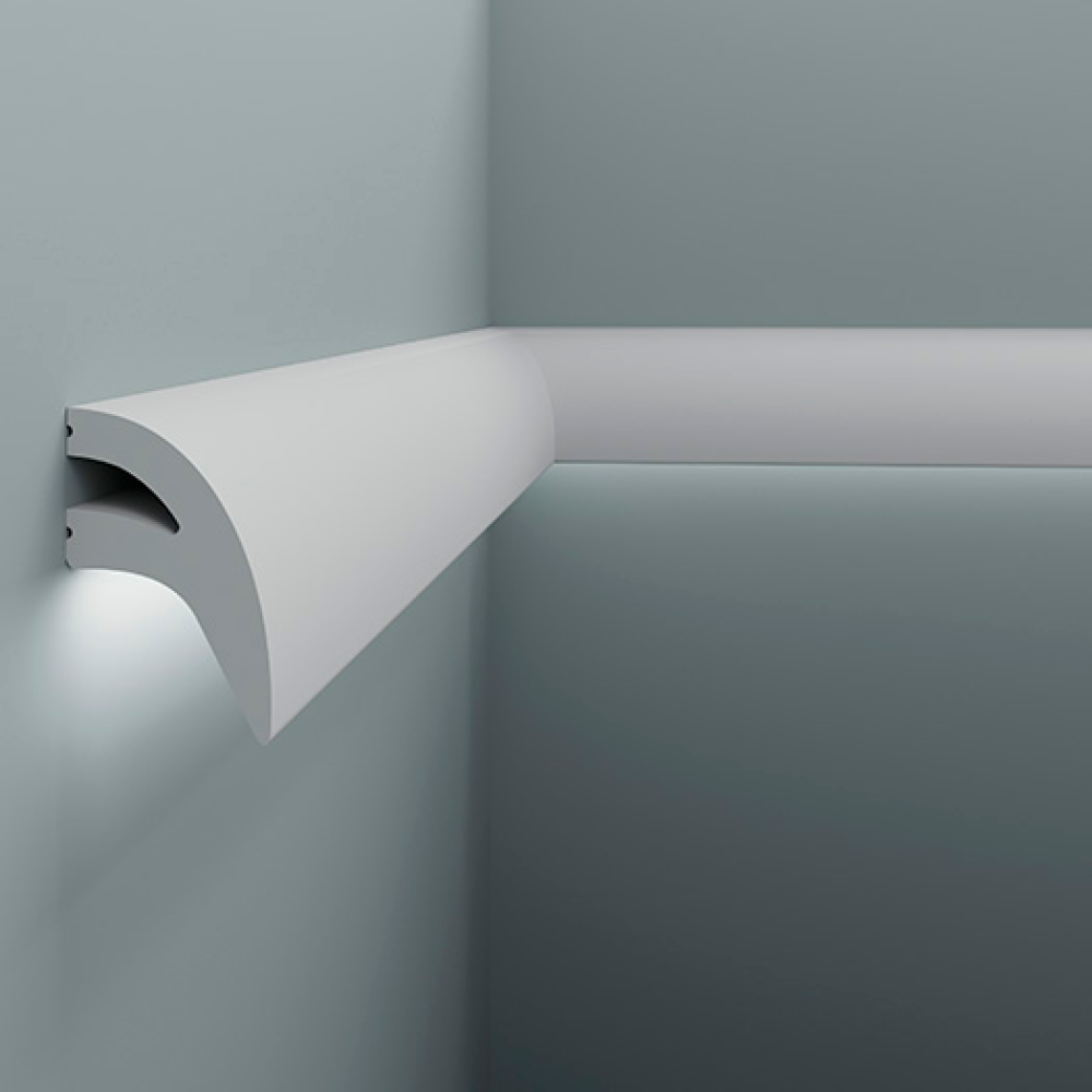 Молдинг уже загрунтован и полностью готов к финишной покраске. Монтаж производится с помощью монтажного клея, а между собой молдинги крепятся на стыковочный клей. Данная модель предусматривает возможность установки светодиодной подсветки, при этом световая лента в комплекте не идет и приобретается отдельно.