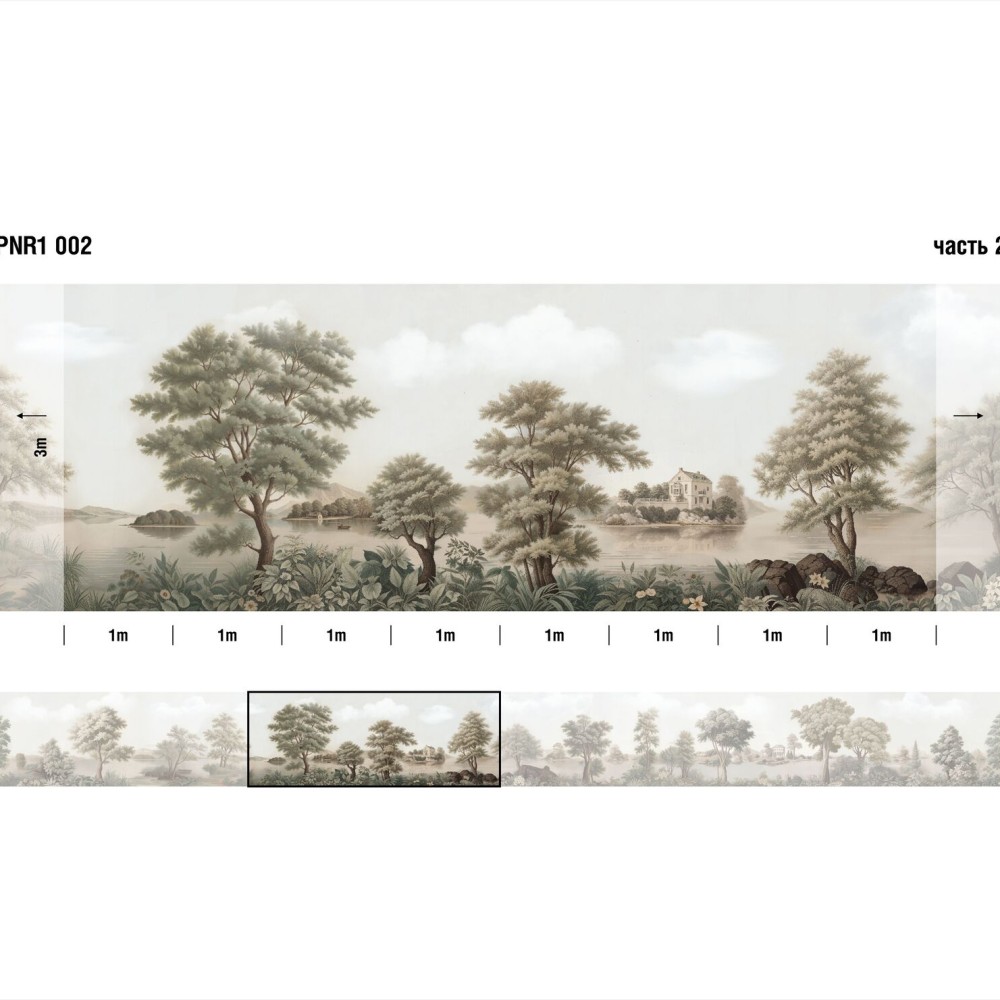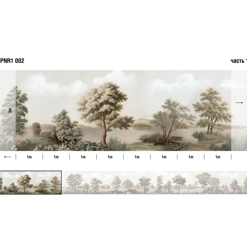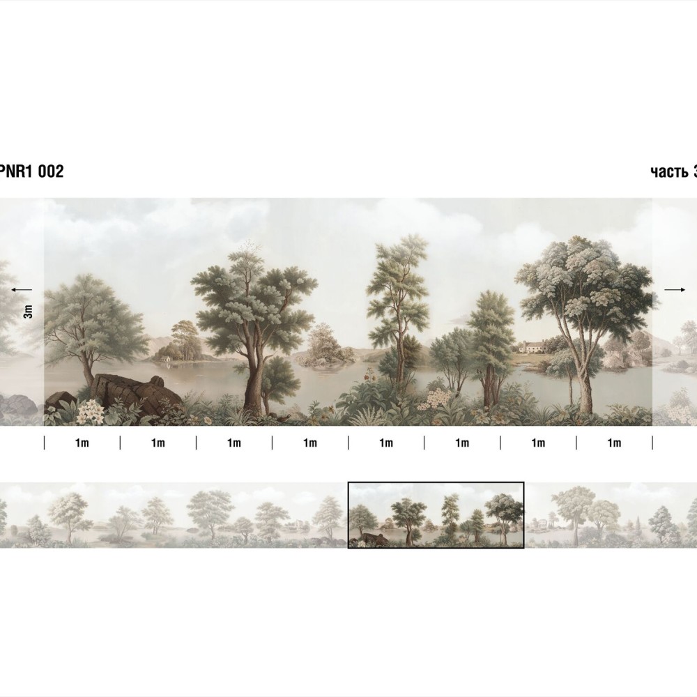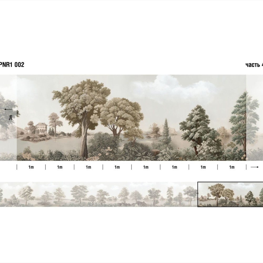 Панно Loymina Панорама нежных парков PNR1 002 изготавливается методом цифровой печати по высококачественному фактурному флизелину. Панно состоит из 32 полос по 100 см шириной и 300 см высотой каждая. Общий размер панно составляет 3 метра в высоту и 32 метра в ширину — площадь покрытия 96 м2. Можно приобрести любое количество полос и создать панно какой угодно длины.
