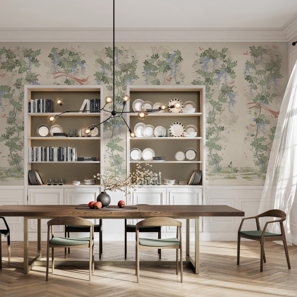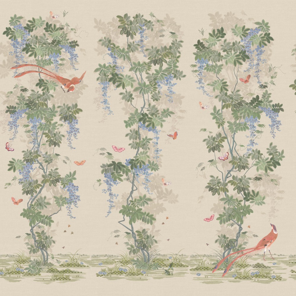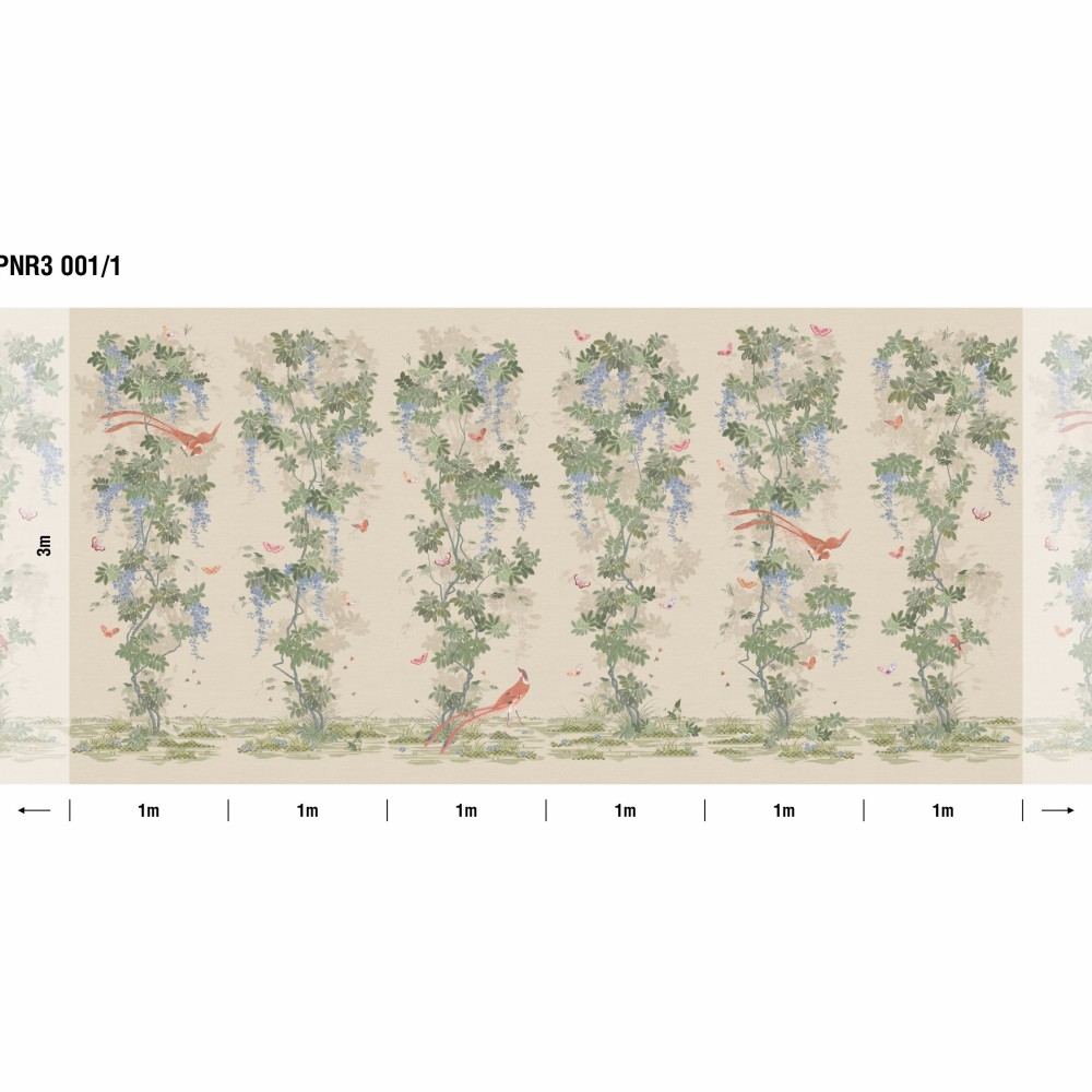 Панно Loymina Панорама Шинуазри: райский сад PNR3 001/1 изготавливается методом цифровой печати по высококачественному фактурному флизелину. Панно состоит из 6 полос по 100 см шириной и 300 см высотой каждая. Общий размер панно составляет 3 метра в высоту и 6 метров в ширину — площадь покрытия 18 м2. Можно приобрести любое количество полос и создать панно какой угодно длины.