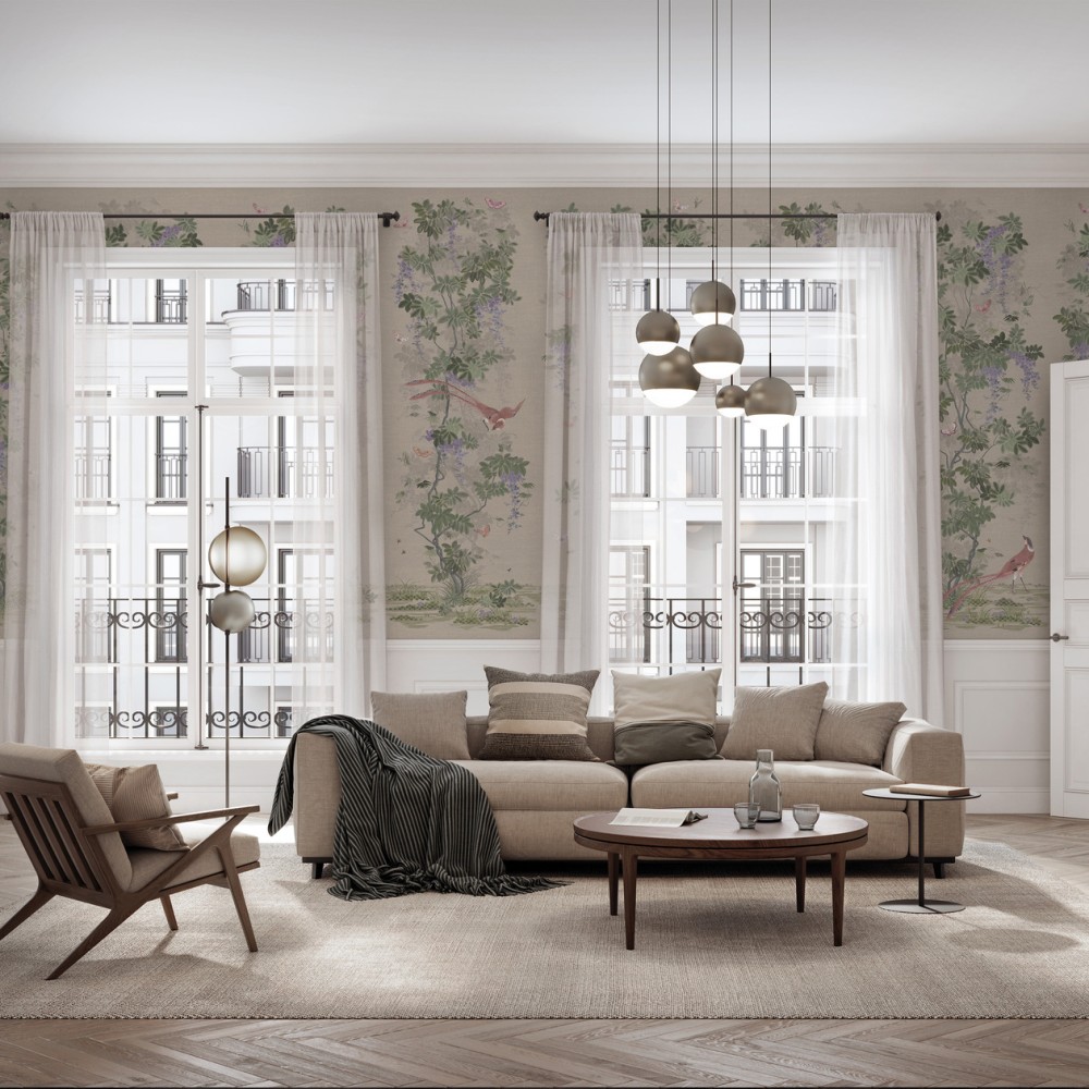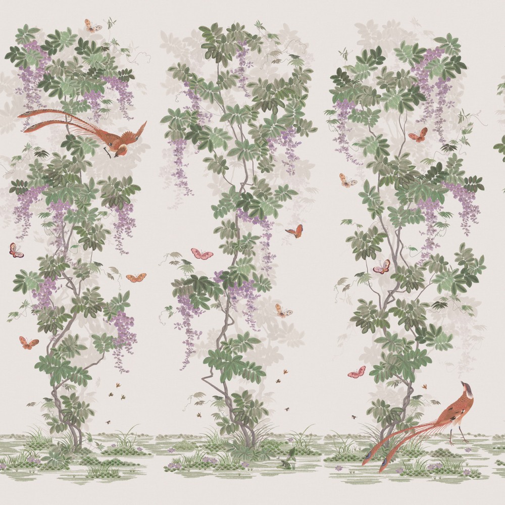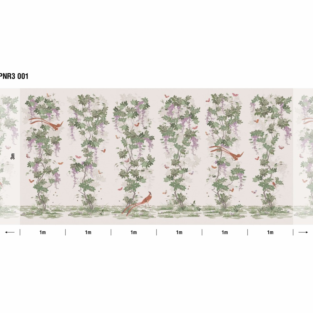 Панно Loymina Панорама Шинуазри: райский сад PNR3 001 изготавливается методом цифровой печати по высококачественному фактурному флизелину. Панно состоит из 6 полос по 100 см шириной и 300 см высотой каждая. Общий размер панно составляет 3 метра в высоту и 6 метров в ширину — площадь покрытия 18 м2. Можно приобрести любое количество полос и создать панно какой угодно длины.