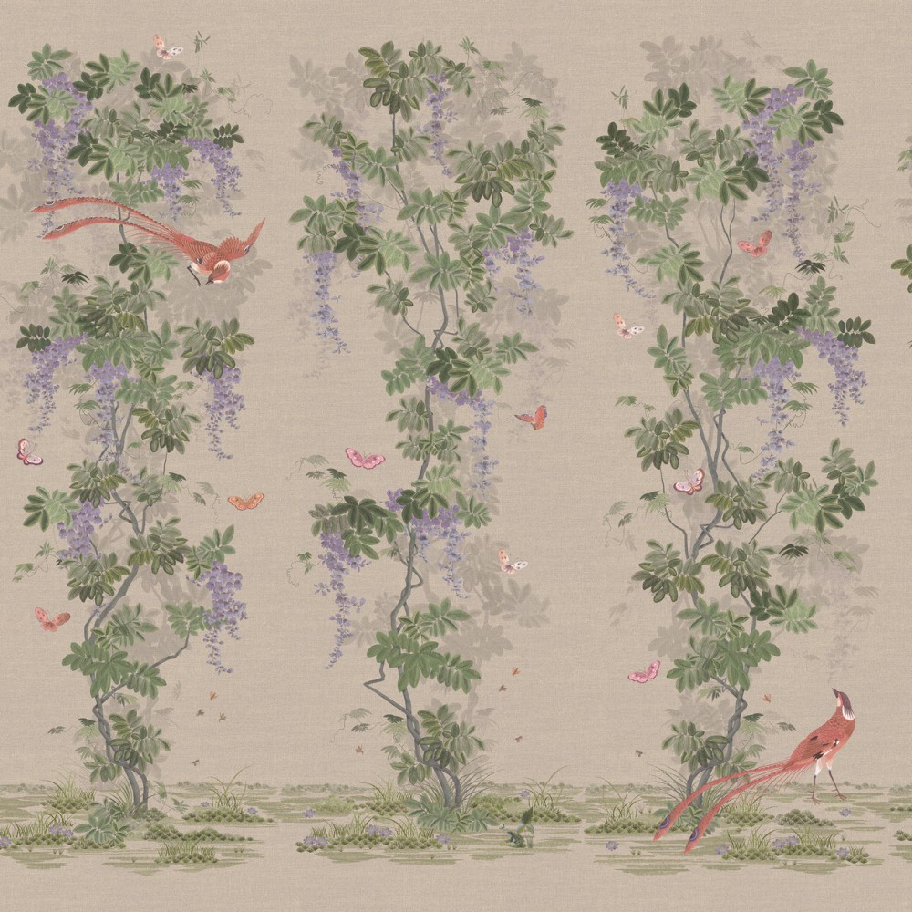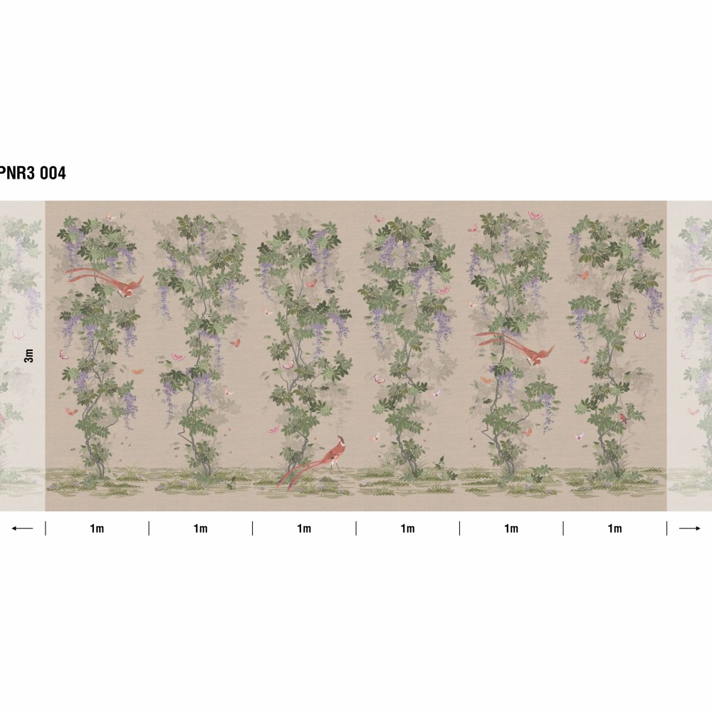 Панно Loymina Панорама Шинуазри: райский сад PNR3 004 изготавливается методом цифровой печати по высококачественному фактурному флизелину. Панно состоит из 6 полос по 100 см шириной и 300 см высотой каждая. Общий размер панно составляет 3 метра в высоту и 6 метров в ширину — площадь покрытия 18 м2. Можно приобрести любое количество полос и создать панно какой угодно длины.