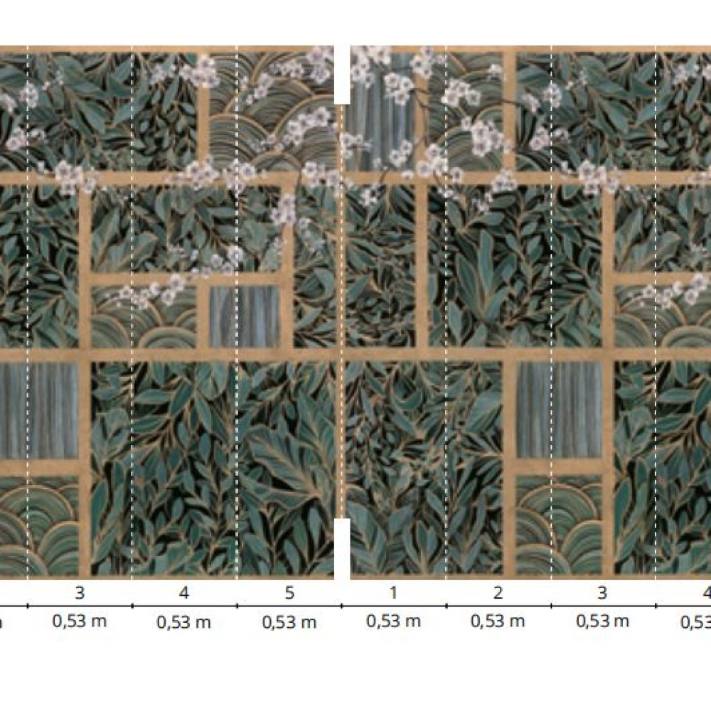 Панно Marburg Casa Vita 36096 состоит из 5 полос высотой 2,7 м и шириной 0,53 м. Общий размер панно — 2,7×2,65 м, площадь покрытия — 7,155 м2.