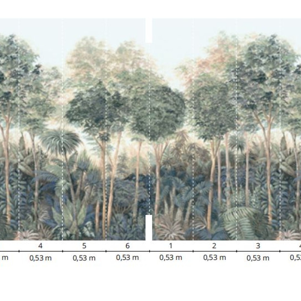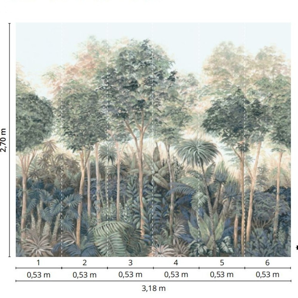 Панно Marburg Casa Vita 36097 состоит из 6 полос высотой 2,7 м и шириной 0,53 м. Общий размер панно — 2,7×3,18 м, площадь покрытия — 8,586 м2.