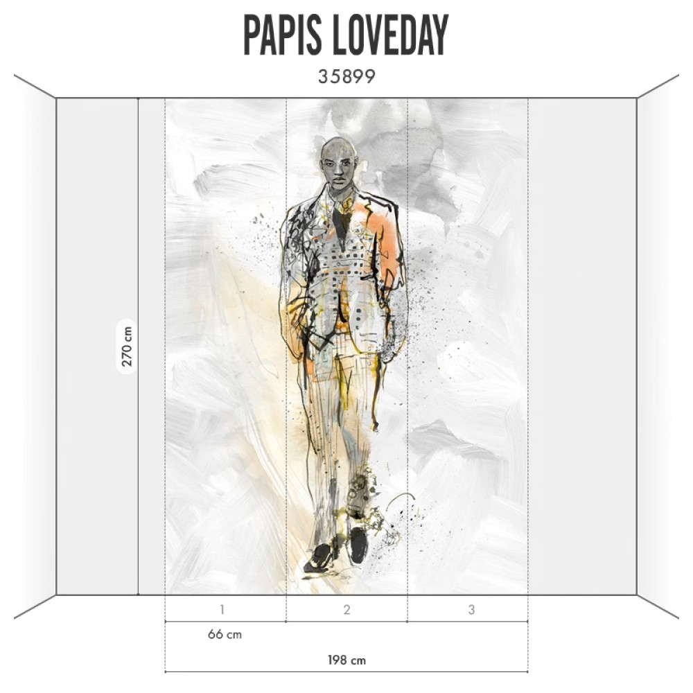 Панно Marburg Papis Loveday Fashion Icon 35899 состоит из 3 полос высотой 2,7 м и шириной 0,66 м. Общий размер панно — 2,7×1,98 м, площадь покрытия — 5,346 м2.