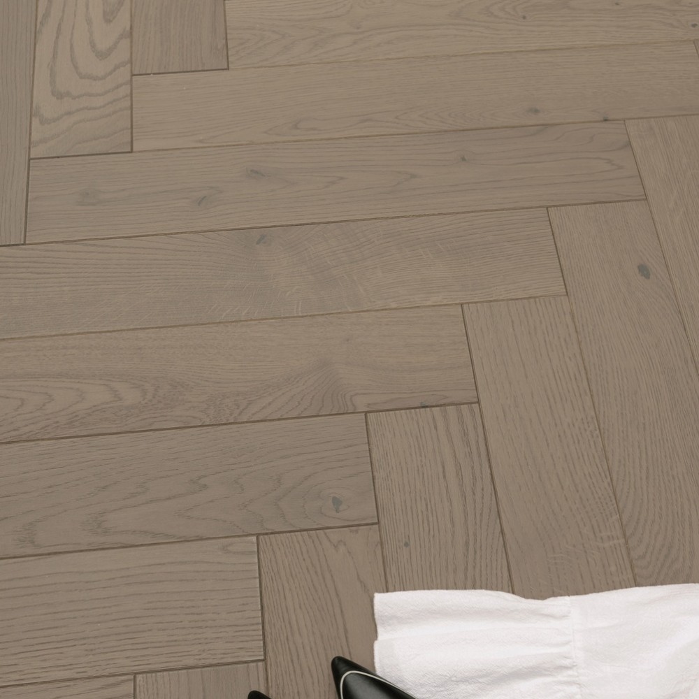 Паркетная доска Дрим Дуб Санторини венгерская елка производится в сортировке Робуст — допускаются естественные вариации цвета, заболонь, сердцевинные лучи, черные сучки, зашпатлеванные трещины и сучки, а также редкие механические дефекты, такие как сколы шириной до 2 мм, на торцых и кромках. Желтизна либо синева не допускаются.