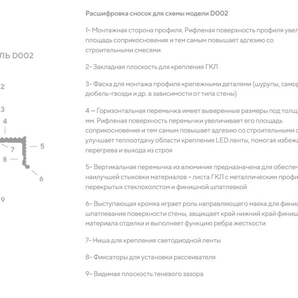 В модели предусмотрена возможность установки LED подсветки (лента приобретается отдельно). Монтаж профиля и малярные работы осуществляются с помощью клея и саморезов после укладки финишного напольного покрытия.
