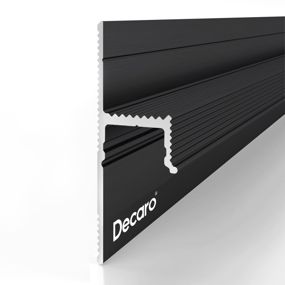 Теневой плинтус Decaro D002A Black изготовлен из алюминия и предназначен для создания эффекта парящих стен (теневой зазор — 15 мм). Применим для стен, пола и потолка из гипсокартона. Может использоваться со всеми типами напольных покрытий.