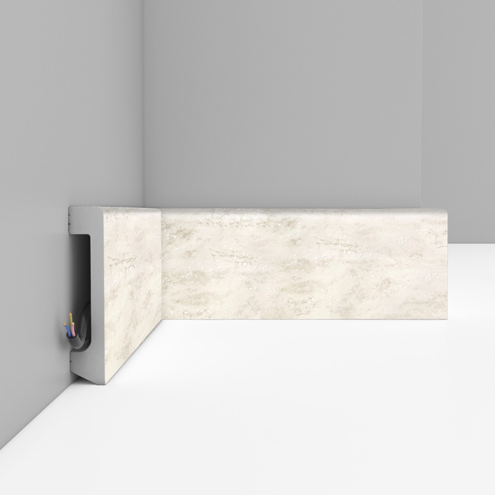 Плинтус Decomaster D235 изготовлен из полистирола — легкого и прочного материала, стойкого к механическим повреждениям и влаге. Подходит для установки в помещениях с повышенной влажностью, таких как ванная комната или кухня. Монтируется с помощью клея.