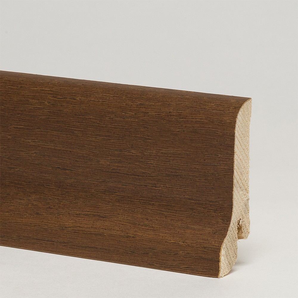 На основание плинтуса приклеивается натуральный шпон дуба толщиной 0,6 мм. Дуб имеет характерный древесный рисунок, насыщенный и выразительный. Он может совмещать в себе множество оттенков — от соломенно-желтого до темно-коричневого с черными вкраплениями. Потемнение со временем незначительное: поверхность приобретает янтарный оттенок.