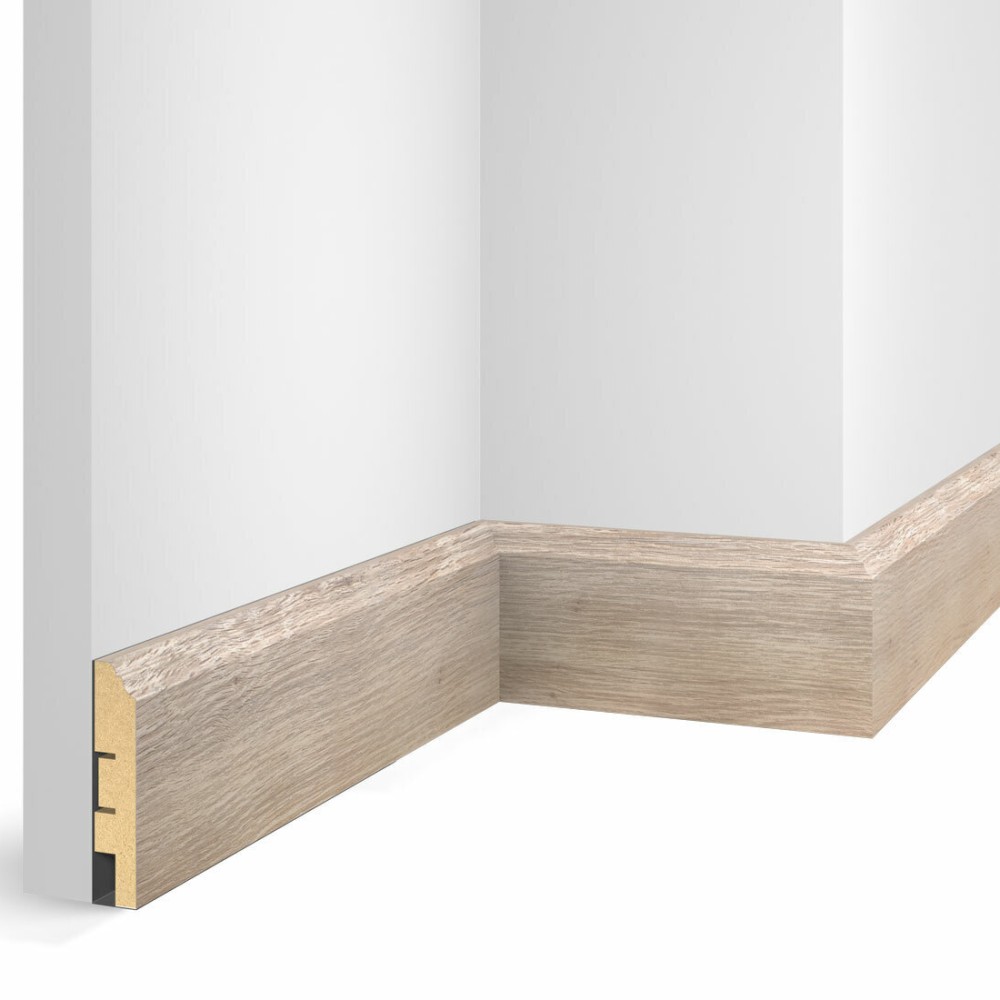 Плинтус Cosca Decor WP07 изготовлен из МДФ и имеет покрытие из экошпона (искусственный шпон из многослойной бумаги, покрытой защитным лаком). Декоры визуально и тактильно повторяют рисунок древесины.