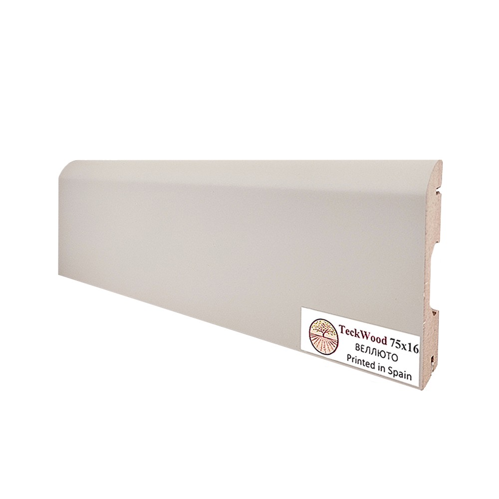 Плинтус TeckWood Веллюто выполнен из прочной и водостойкой МДФ-плиты, на которую нанесена цветная виниловая пленка испанского производителя. Пленка устойчива к бытовой химии, не выцветает на солнце.