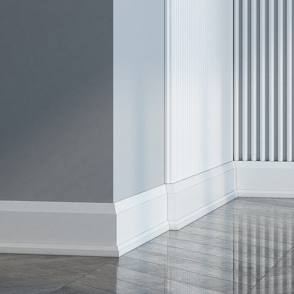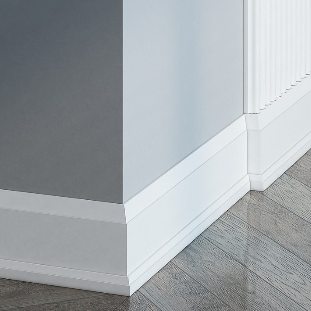 Поверхность изделия загрунтована и готова к покраске. Монтаж производится с помощью монтажного клея, а между собой плинтусы крепятся на стыковочный клей.