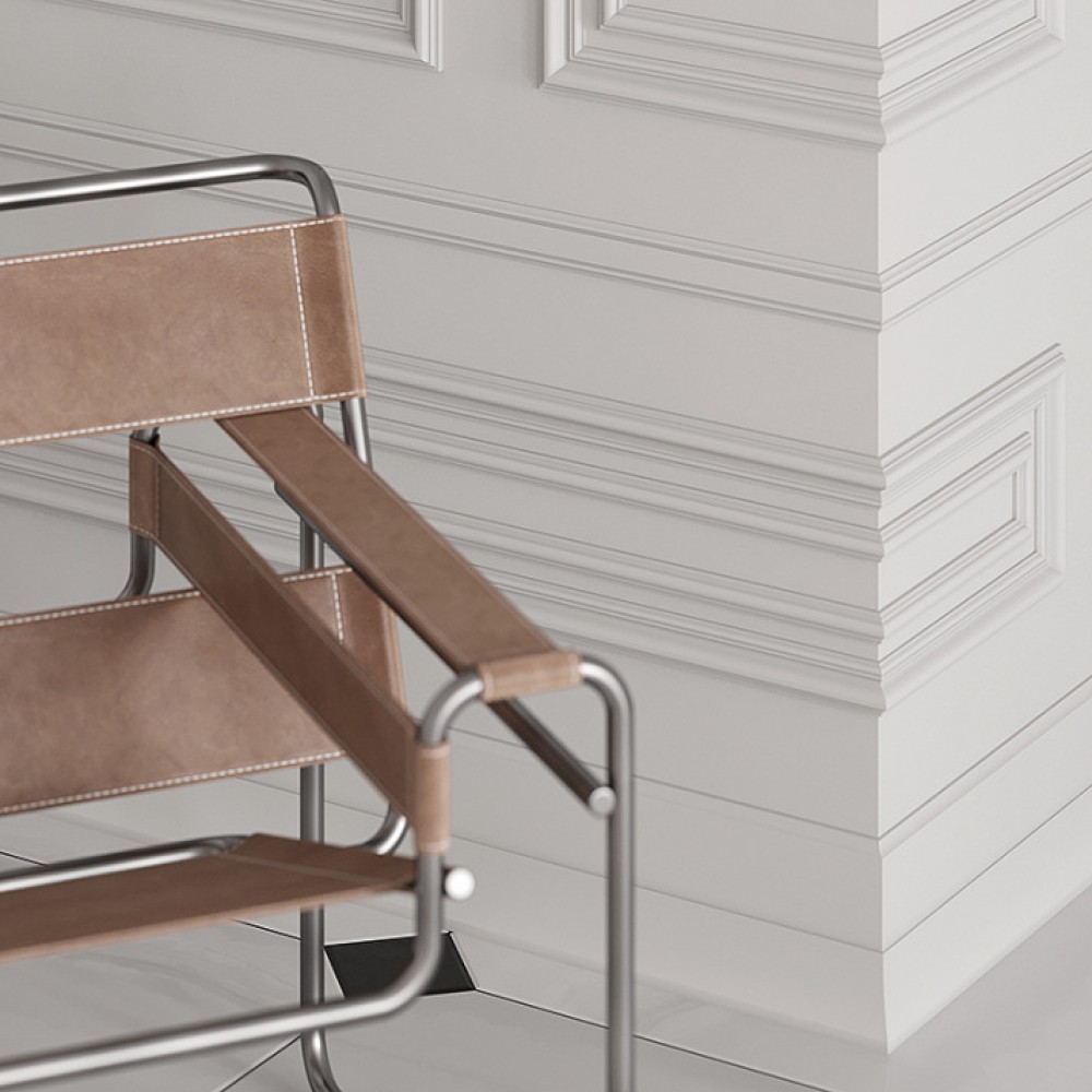 Поверхность изделия загрунтована и готова к покраске. Монтаж производится с помощью монтажного клея, а между собой плинтусы крепятся на стыковочный клей.