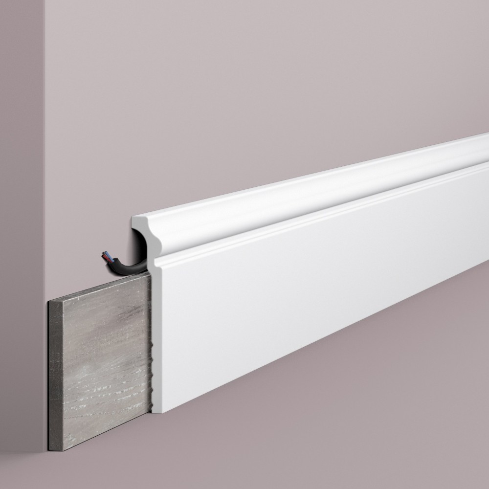 Плинтус под покраску NMC CF3 выполнен из полистирола — прочного и стойкого к износу материала. Данную модель можно монтировать на старый плинтус. Декор загрунтован и готов к покраске.