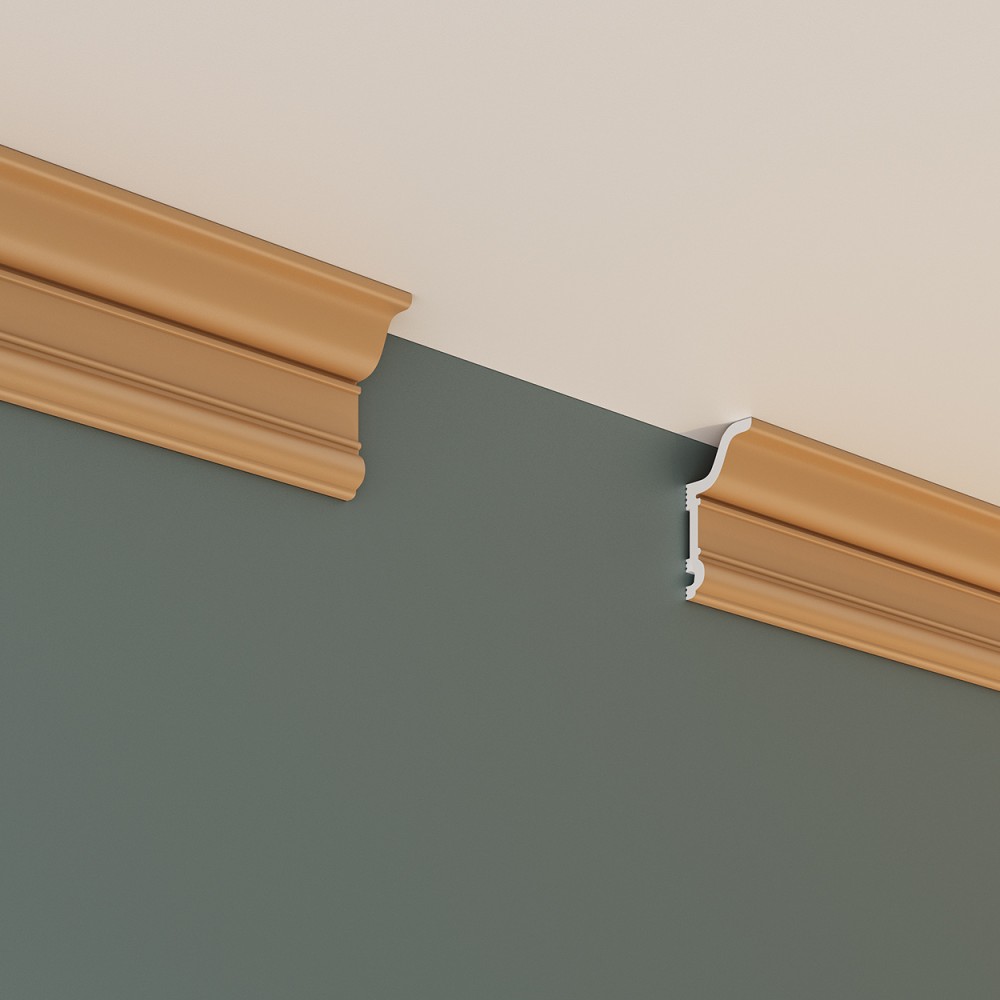 Потолочный плинтус под покраску Cosca Decor KX046 изготовлен из экополимера (полистирола) — ударопрочного и влагостойкого материала. Изделие загрунтовано в своей массе — его можно красить любой краской, либо использовать неокрашенным, при этом экополимер не пожелтеет со временем и сохранит свой белый цвет благодаря светостабилизатору в составе.