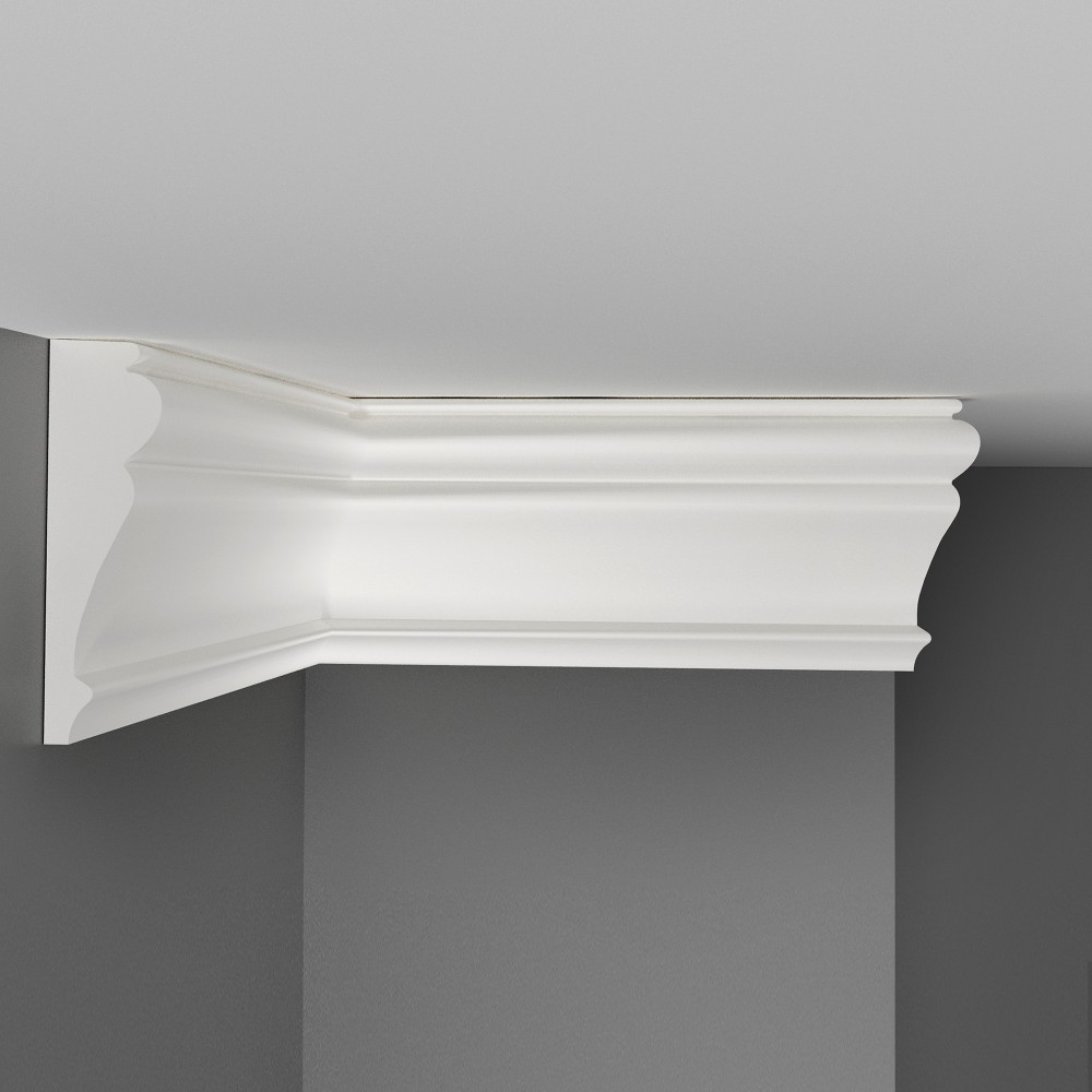 Карниз под покраску Decomaster Дюропрофиль изготовлен из полистирола высокой плотности — ударопрочного и влагостойкого материала. Декор готов к покраске сразу после установки. Для окрашивания подходят акриловые краски. Установка карнизов производится с помощью клея.