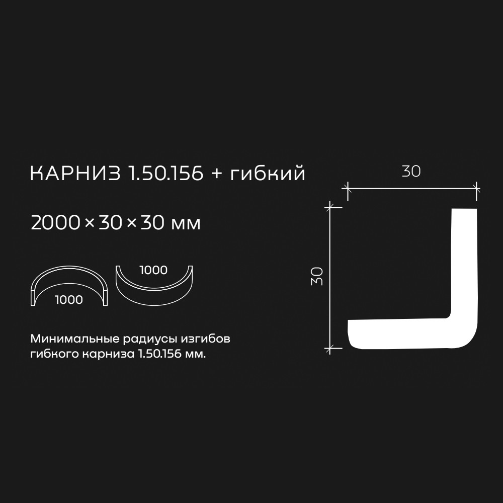 Потолочный плинтус под покраску Европласт 1.50.156 изготовлен из гибкого и влагостойкого пенополиуретана. Материал не выделяет вредных веществ и устойчив к образованию грибка, поэтому подходит для ванных комнат, санузлов, кухонь и балконов. Плинтус может использоваться на закругленных поверхностях и имеет радиус изгиба выпуклый — 1000 мм, радиус изгиба вогнутый — 1000 мм.