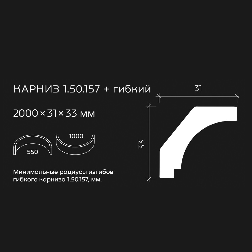 Потолочный плинтус под покраску Европласт 1.50.157 изготовлен из гибкого и влагостойкого пенополиуретана. Материал не выделяет вредных веществ и устойчив к образованию грибка, поэтому подходит для ванных комнат, санузлов, кухонь и балконов. Плинтус может использоваться на закругленных поверхностях и имеет радиус изгиба выпуклый — 1000 мм, радиус изгиба вогнутый — 550 мм.