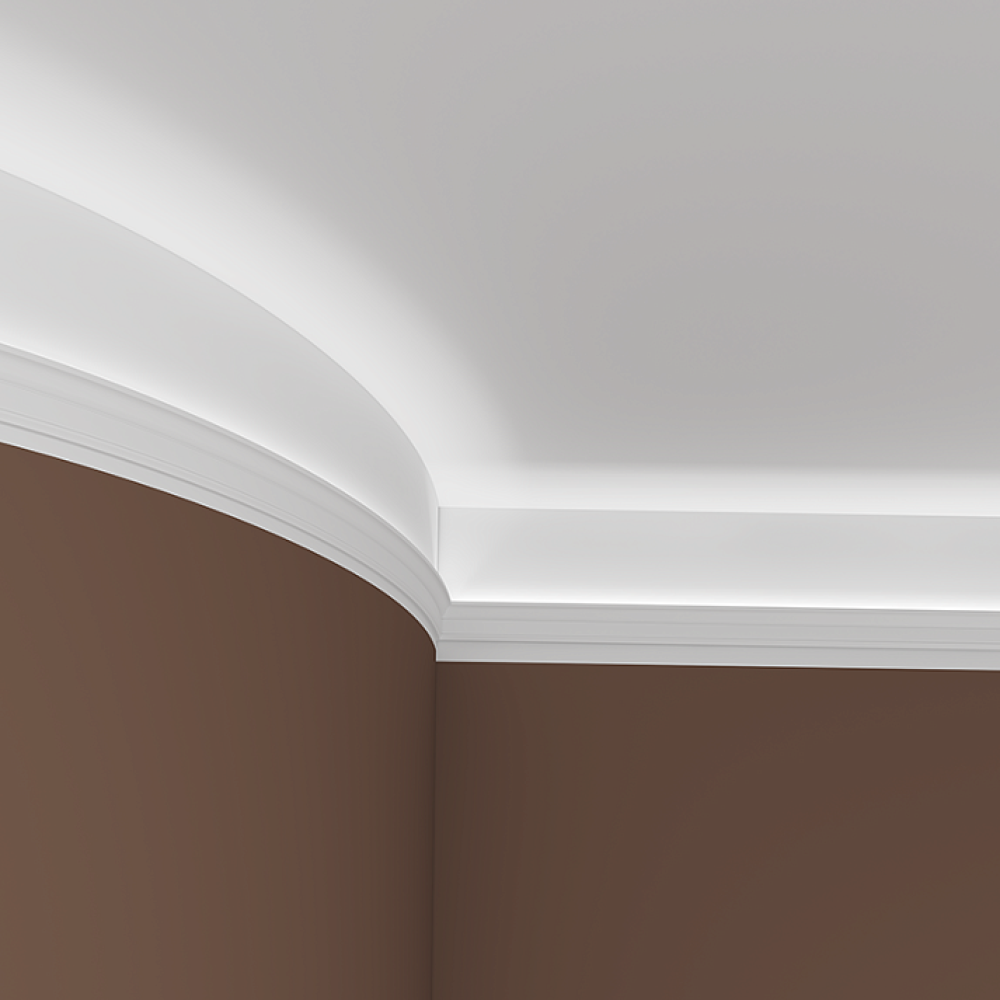 Потолочный плинтус под покраску Европласт 1.50.174 изготовлен из гибкого и влагостойкого пенополиуретана. Материал не выделяет вредных веществ и устойчив к образованию грибка, поэтому подходит для ванных комнат, санузлов, кухонь и балконов. Плинтус может использоваться на закругленных поверхностях и имеет радиус изгиба выпуклый — 1500 мм, радиус изгиба вогнутый — 1000 мм.