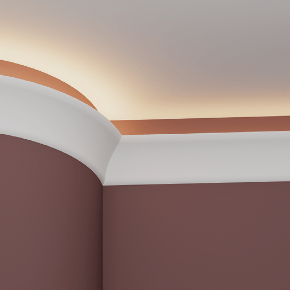 Потолочный плинтус под покраску Европласт 1.50.623 изготовлен из гибкого и влагостойкого пенополиуретана. Материал не выделяет вредных веществ и устойчив к образованию грибка, поэтому подходит для ванных комнат, санузлов, кухонь и балконов. Плинтус может использоваться на закругленных поверхностях и имеет радиус изгиба — 3500 мм.