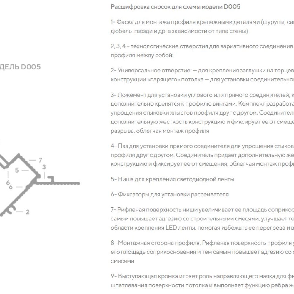 В модели предусмотрена возможность установки LED подсветки (лента приобретается отдельно). Угол направления света составляет 45 градусов, что позволяет скрыть неровности финишной отделки стены. Монтаж профиля осуществляется с помощью дюбелей и шурупов к металлокаркасу потолка.