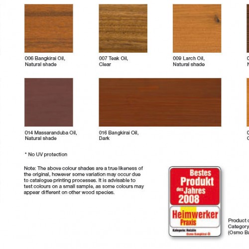 Osmo Terrassen-Ole 009 Лиственница — это специальное масло для террасы. Оно глубоко проникает в структуру дерева, регулирует его влажность, предотвращая его набухание и высыхание, оставляя поры дерева открытыми. Поверхность, обработанная маслом для террас, не требует специального ухода, она устойчива к моющим средствам, пятнам от продуктов. К тому же поверхность соответсвует стандарту DIN 68861−1C.