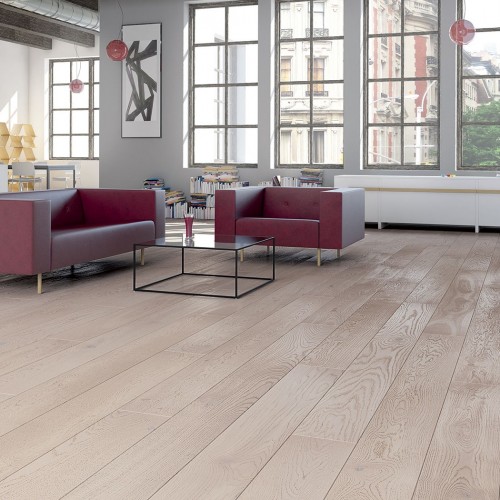 Паркетная доска Barlinek Pure дуб Biscuits Grande имеет светлый выбеленный оттенок, благодаря покрытию специальным тонирующим маслом. При этом природный богатый рисунок дуба остался выраженным и заметным. Кроме того, его подчеркивает рельеф, созданный по технологии браширования. Однополосный дизайн доски хорошо заметен даже после укладки, благодаря нанесенным по краям доски фаскам. Они создают красивые стыки между плашками, делая пол более фактурным.