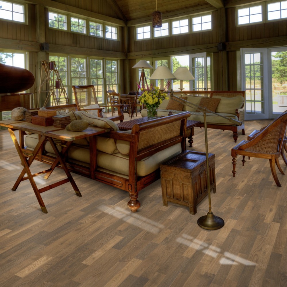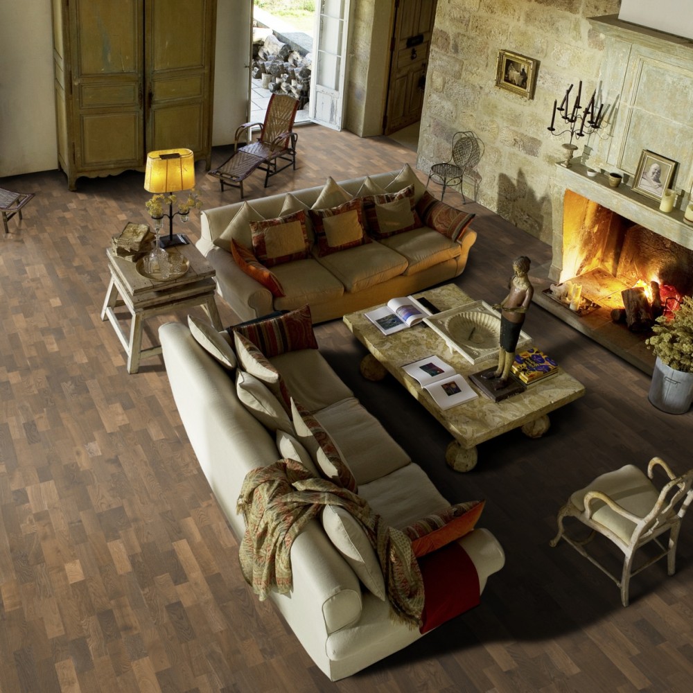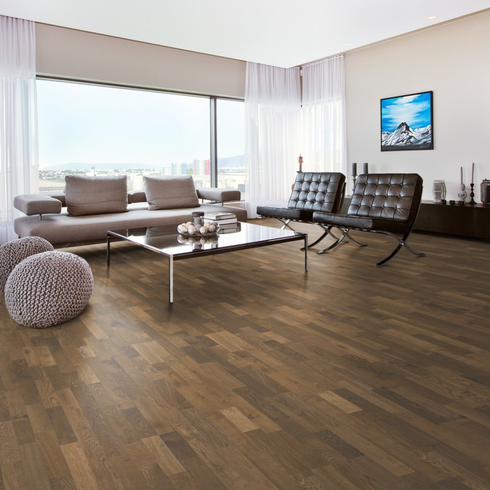 Насыщенный земельный цвет 3-полосного Дуба Мгла получен с помощью специальной обработки «копчение», которая подчеркивает естественные особенности древесины. Каждая доска тщательно обработана щёткой до совершенства, в результате чего из тёмных оттенков возникает вневременная рустикальная выразительность. Покрытие ультраматовым лаком подчёркивает естественные узоры древесины, создавая впечатление необработанного, недавно распиленного дерева. Кроме того, такое покрытие эффективно устраняет блики и защищает пол от ежедневного износа.
