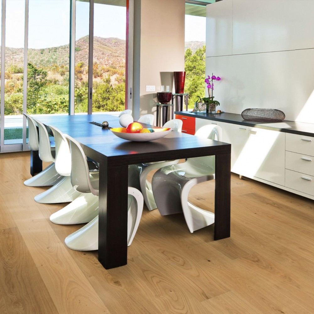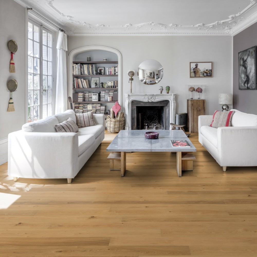 Однополосный дубовый декор из коллекции Люкс успокаивает своими тёплыми, легкими акварельными полутонами. Четырехсторонняя микро-фаска создаёт впечатление традиционного дощатого пола. Каждая доска тщательно обработана щёткой до совершенства, подчёркивая естественную красоту древесины. Покрытие ультраматовым лаком подчёркивает естественные узоры древесины, создавая впечатление необработанного, недавно распиленного дерева. Кроме того, такое покрытие эффективно устраняет блики и защищает пол от ежедневного износа.