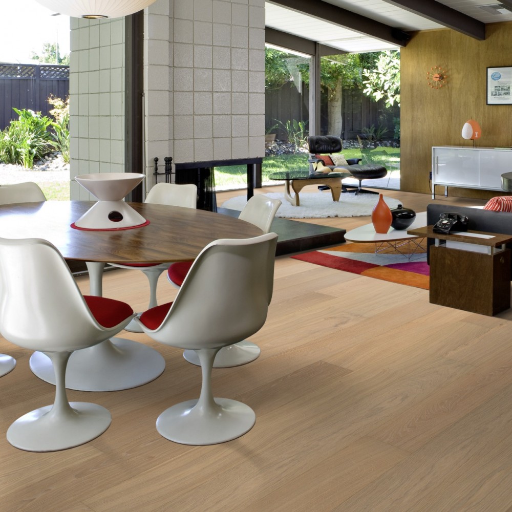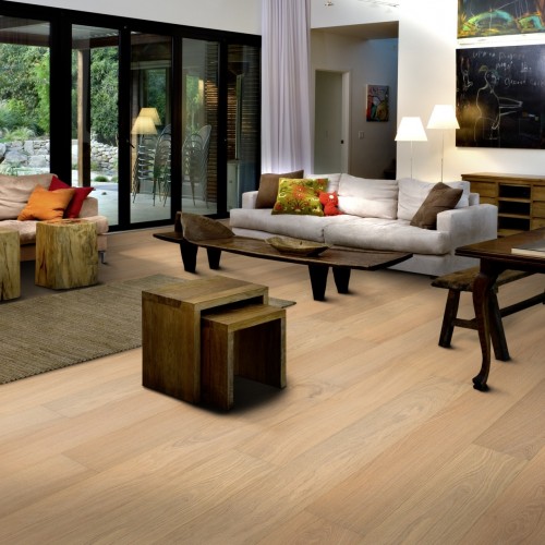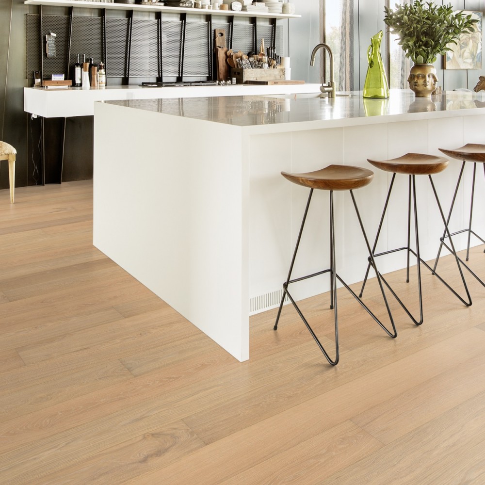 Паркетная доска Kahrs Дуб Париж (Paris) — однополосная доска светло-бежевого цвета. По желанию можно выбрать паркет с покрытием лаком либо маслом. Легкая брашировка подчеркивает структуру дуба, а светлая тонировка создает ощущение белой патины в порах.