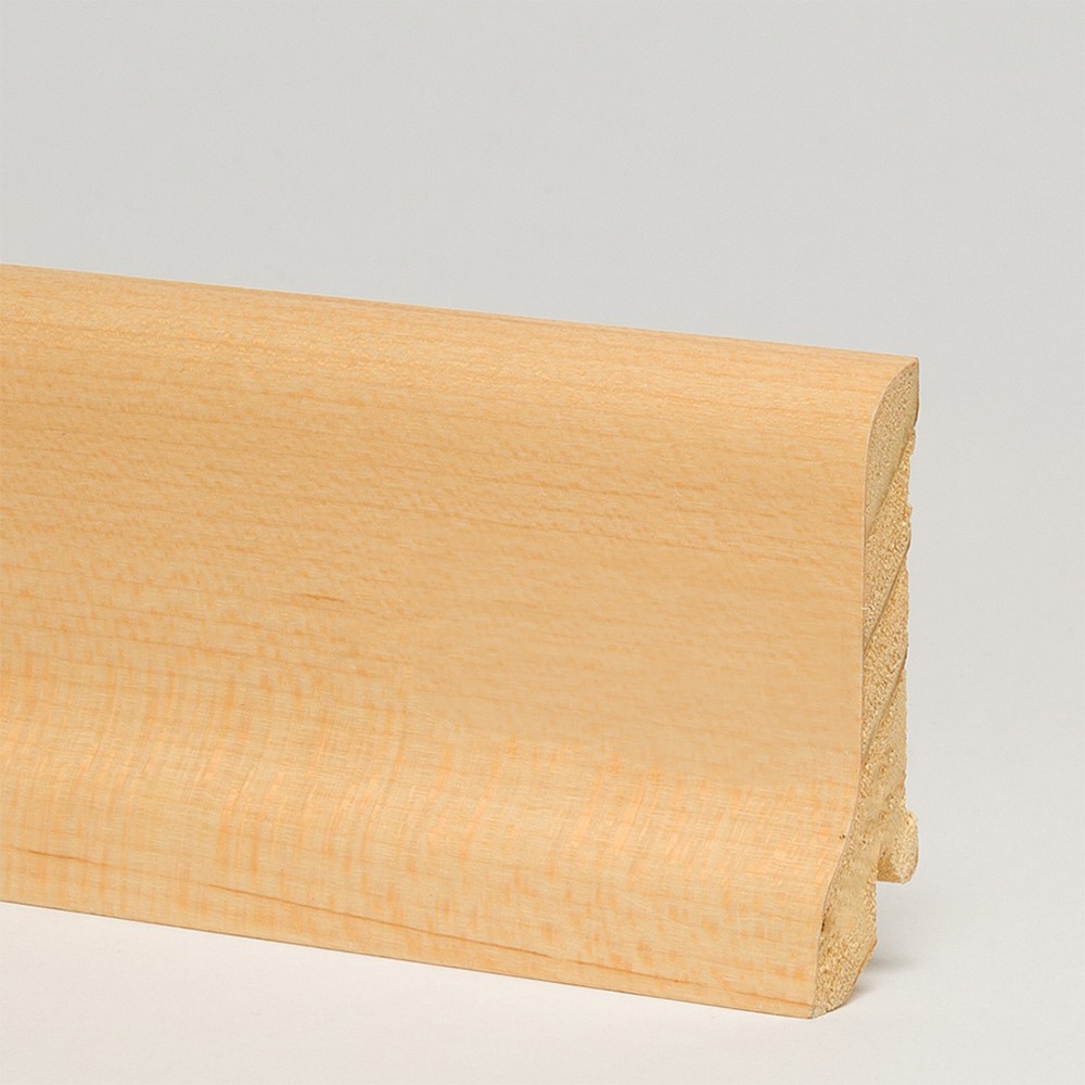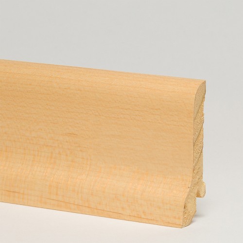На основание плинтуса приклеивается натуральный шпон клена толщиной 0,6 мм. Клен хорошо поддается обработке, полировке и окрашиванию. Его текстура волнистая, а поверхность приобретает глянцевый блеск после обработки. Хорошо просушенная древесина не деформируется и отличается долговечностью и износоустойчивостью. Недостаток клена — низкая биостойкость — устраняется с помощью различных защитных составов.