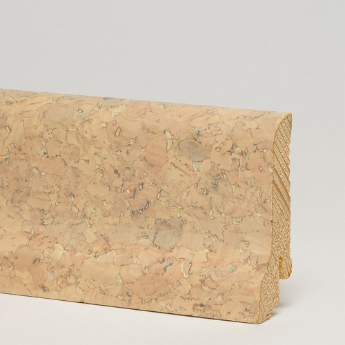 На основание плинтуса приклеивается натуральный шпон пробкового дерева толщиной 0,6 мм. Пробковым деревом называют вид деревьев, традиционно произрастающих в Северной Африке и на территории Европы. Пробковый дуб в наши дни с успехом выращивается и в странах Средиземноморья. Наряду с изготовлением пробки, древесина и кора этого вида используется для производства замечательных напольных покрытий, которые славятся теплотой, шумопоглощением и исключительной влагостойкостью.