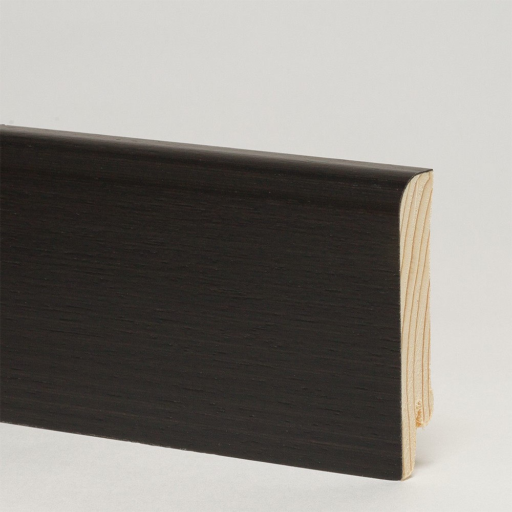 Основание деревянного шпонированного плинтуса Pedross дуб Черный 70х15 изготавливается из срощенного елового бруса. Каждые 30 см древесина склеивается самым надежным — пальцевым методом, поэтому остов плинтуса получается стабильным. Его «не ведет» и «не гнёт» в отличии от плинтуса изготавливаемого из цельного бруса.