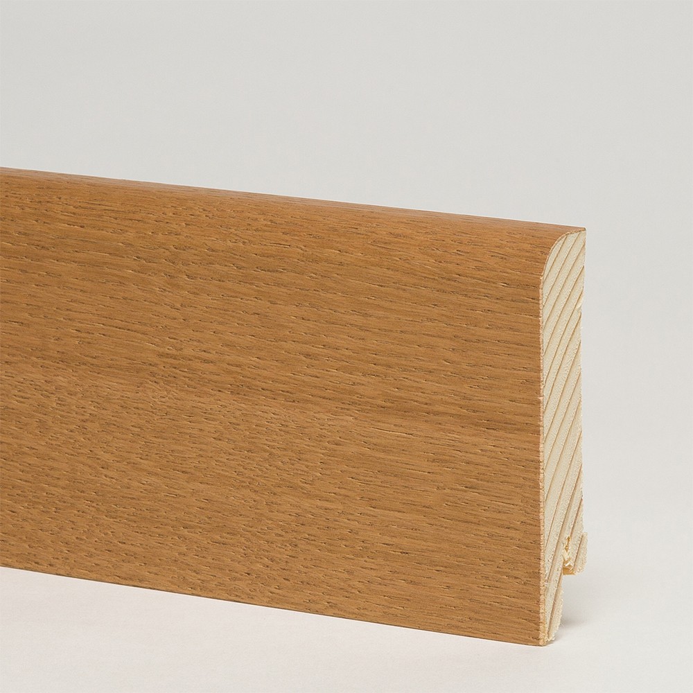 Основание деревянного шпонированного плинтуса Pedross дуб Коньяк 70х15 изготавливается из срощенного елового бруса. Каждые 30 см древесина склеивается самым надежным — пальцевым методом, поэтому остов плинтуса получается стабильным. Его «не ведет» и «не гнёт» в отличии от плинтуса изготавливаемого из цельного бруса.
