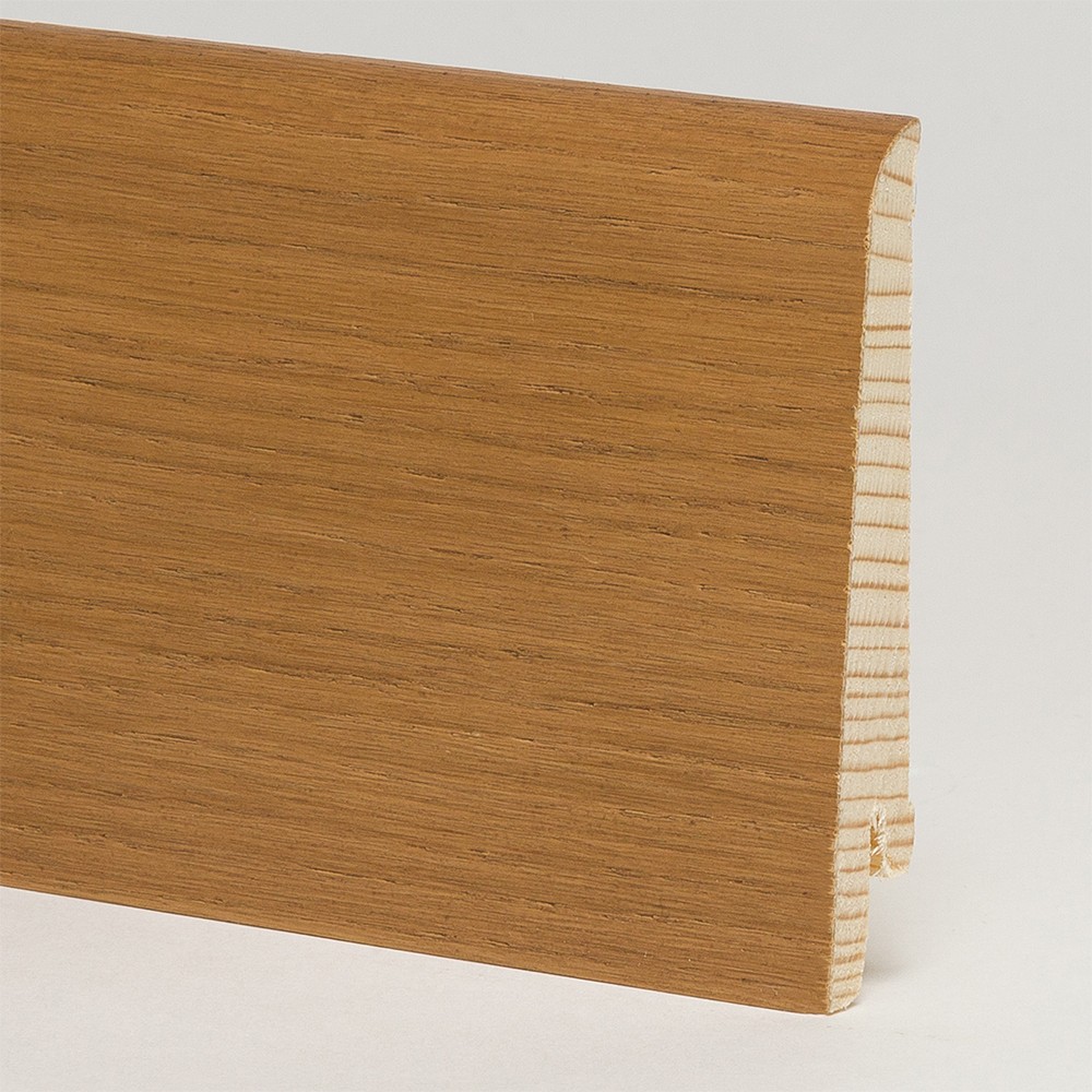 Основание деревянного шпонированного плинтуса Pedross дуб Коньяк 80х16 изготавливается из срощенного елового бруса. Каждые 30 см древесина склеивается самым надежным — пальцевым методом, поэтому остов плинтуса получается стабильным. Его «не ведет» и «не гнёт» в отличии от плинтуса изготавливаемого из цельного бруса.